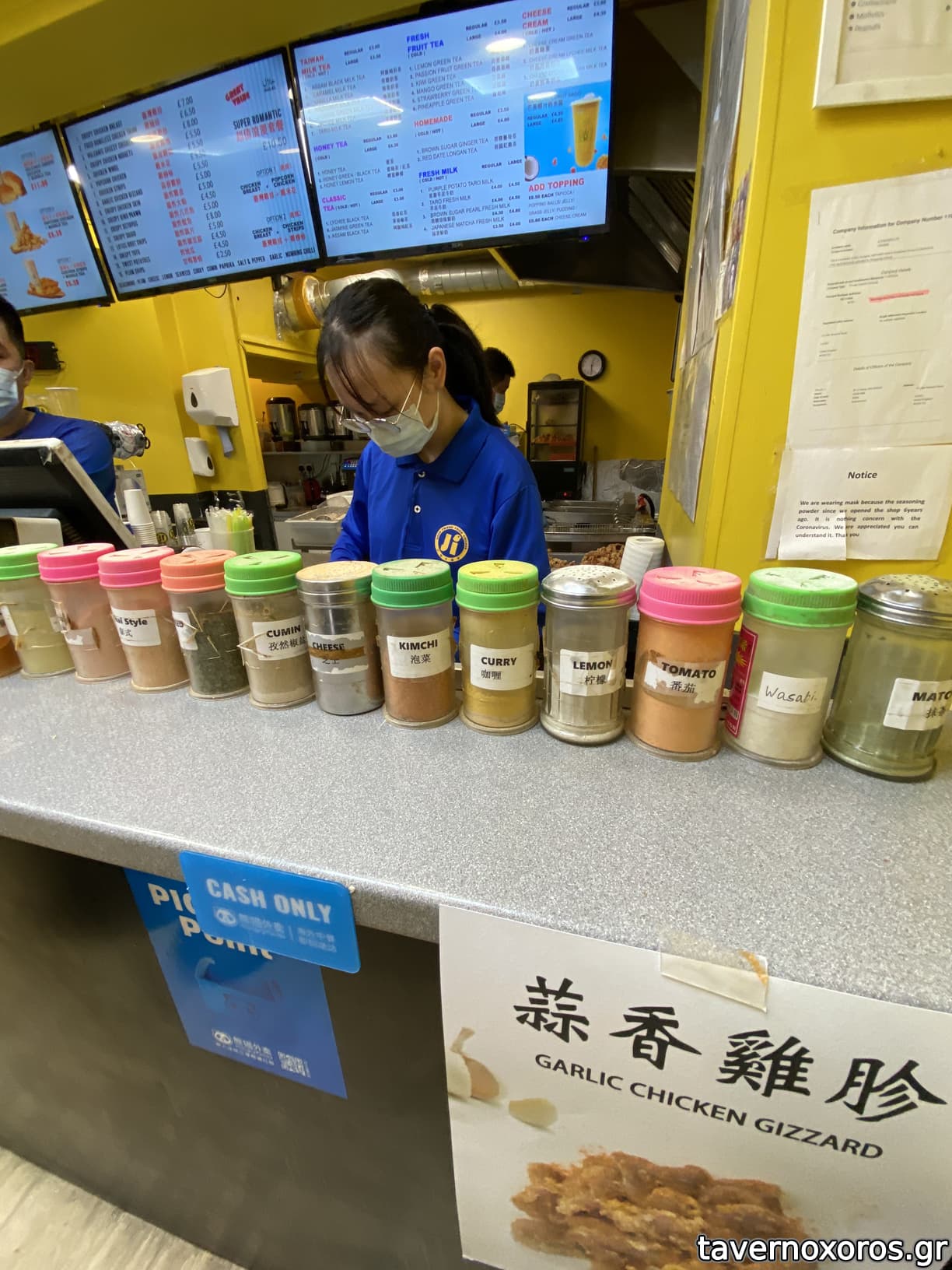 Μόλις βγεί το κοτόπουλο έχεις επιλογές για να το γαρνίρεις με 15 διαφορετικές πούδρες ( από κιμτσι και wasabi μέχρι φύκια).