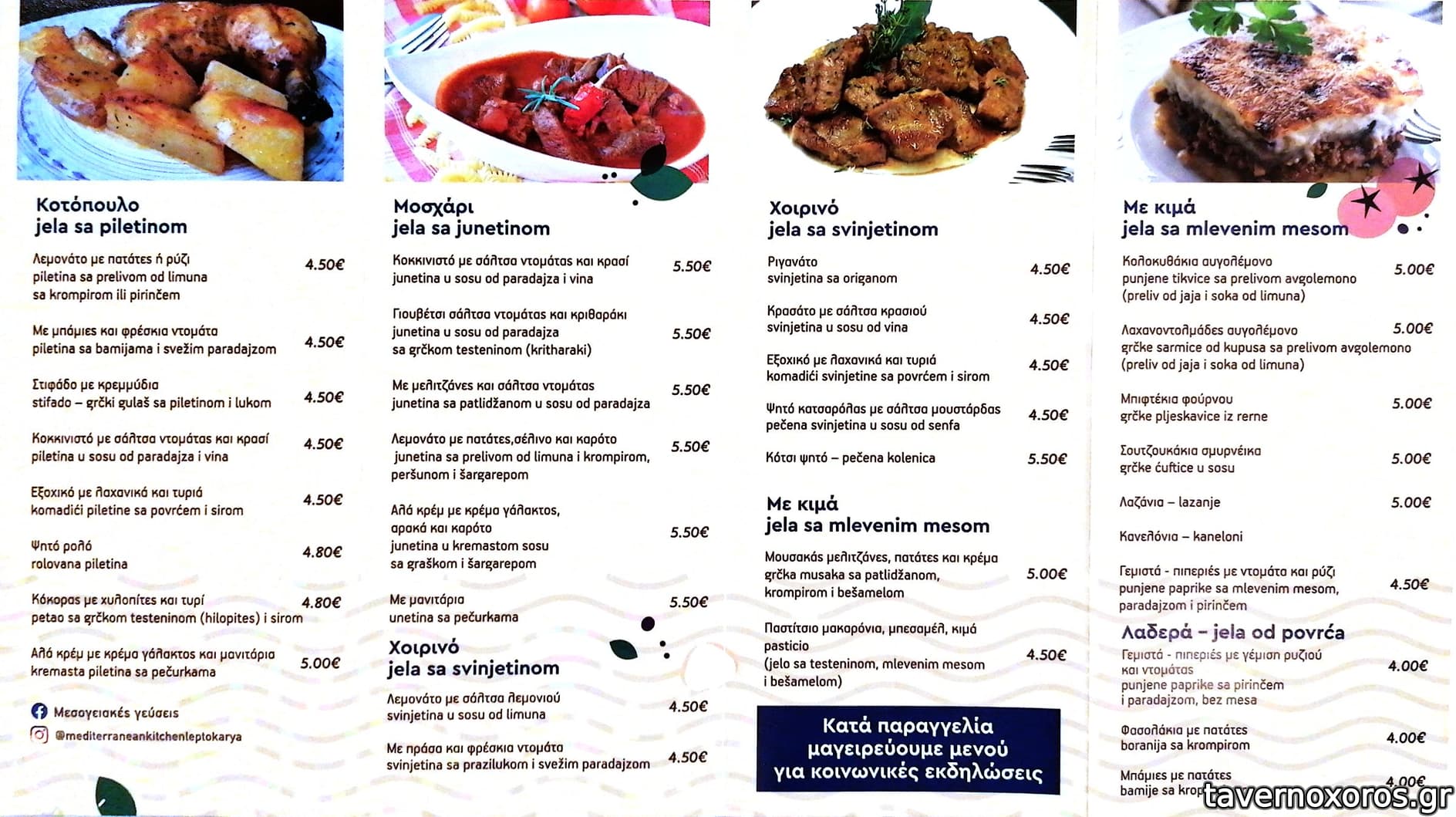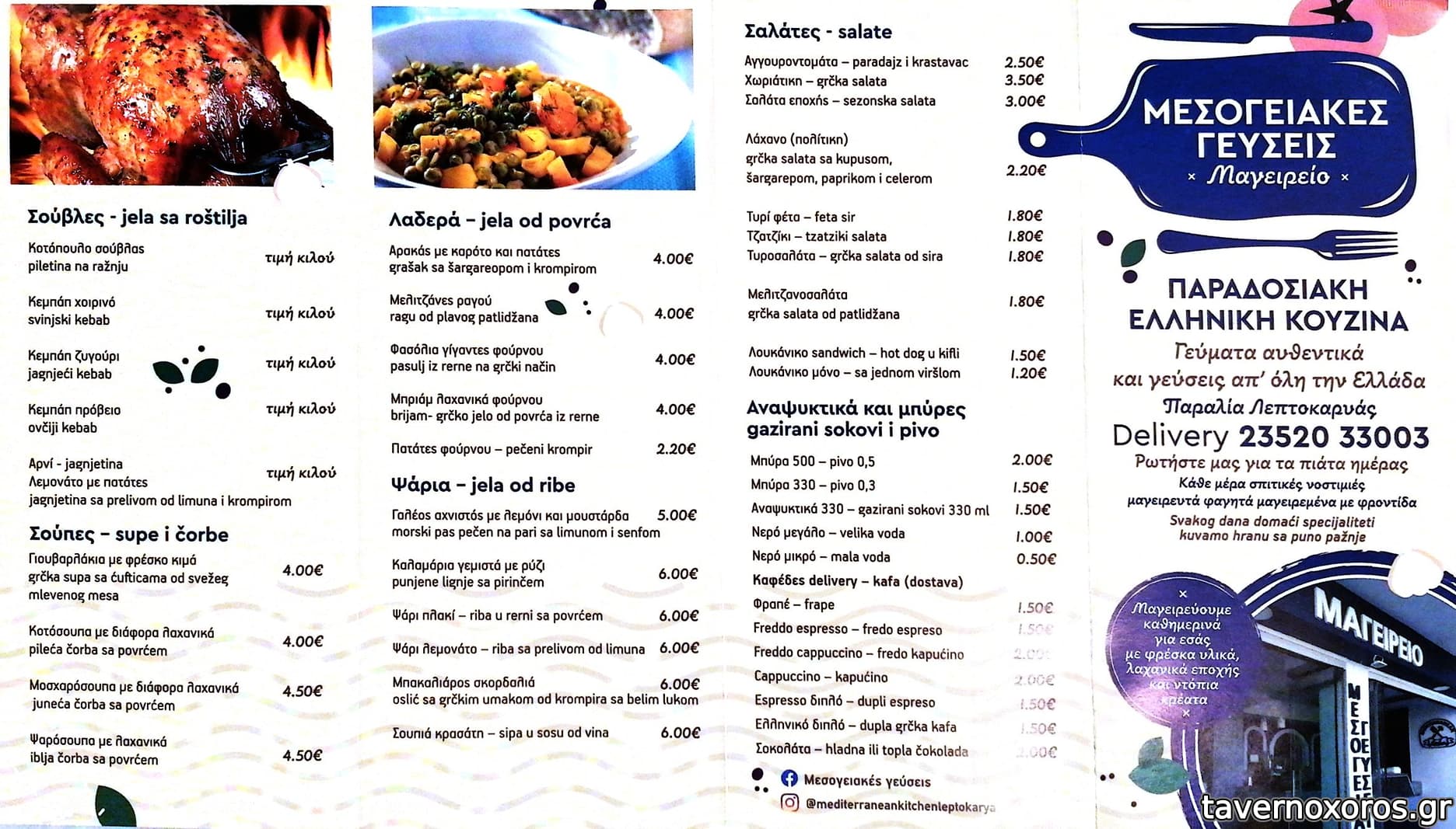| Λέξεις κλειδιά | #take away, #σούβλες, #κεμπάπ, #ζυγούρι, #αρνί, #πρόβειο, #κοτόπουλα σούβλας, #βραστό, #ψαρόσουπα, #σουπιά κρασάτη, #γαλέος, #μπακαλιάρος σκορδαλιά, #φασόλια γίγαντες, #λεμονάτο, #στιφάδο, #κόκορας, #γιουβέτσι, #ριγανάτο, #κότσι, #μουσακάς, #παστίτσιο, #λαχανοντολμάδες, #σουτζουκάκια σμυρνέικα, #κανελόνια, #γεμιστά |