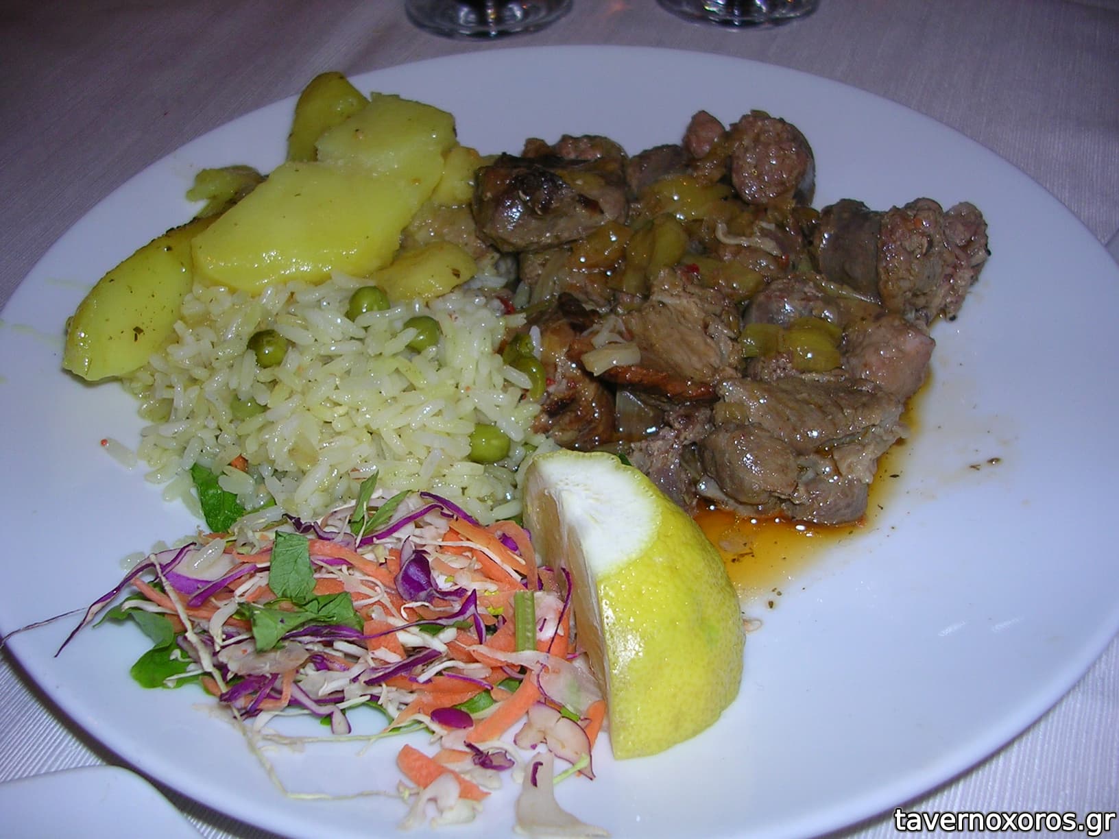 -1 μεριδα μοσχαρι με δαμασκηνα. Πολυ νοστιμη σαλτσουλα, καλομαγειρεμενο το κρεας. Καλη σε μεγεθος μεριδα. Γαρνιτουρα φρεσκοτηγανισμενες πατατες, και απαραδεκτο ρυζι/ασβεστο-στοκος. Στα 10€