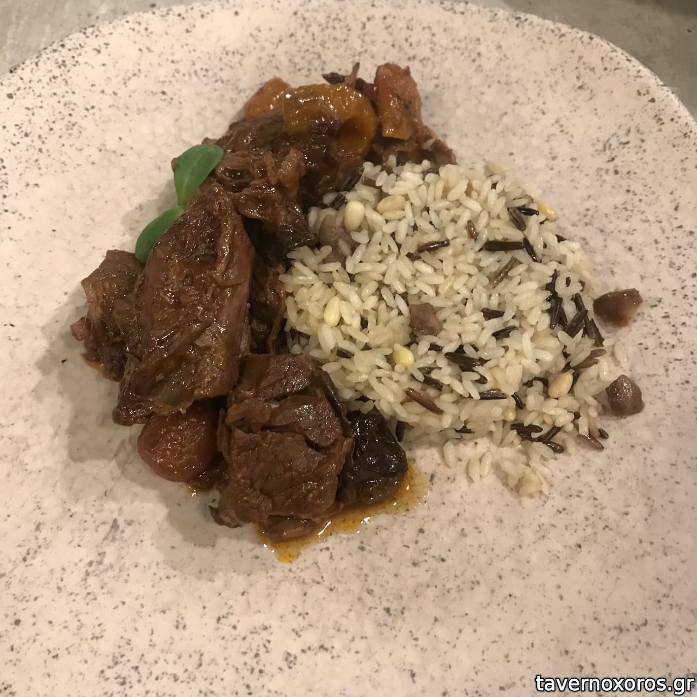Πιάτο ημέρας, μοσχάρι ελευθέρας σε κρασί, με αποξηραμένα φρούτα και ανάμικτο ρύζι