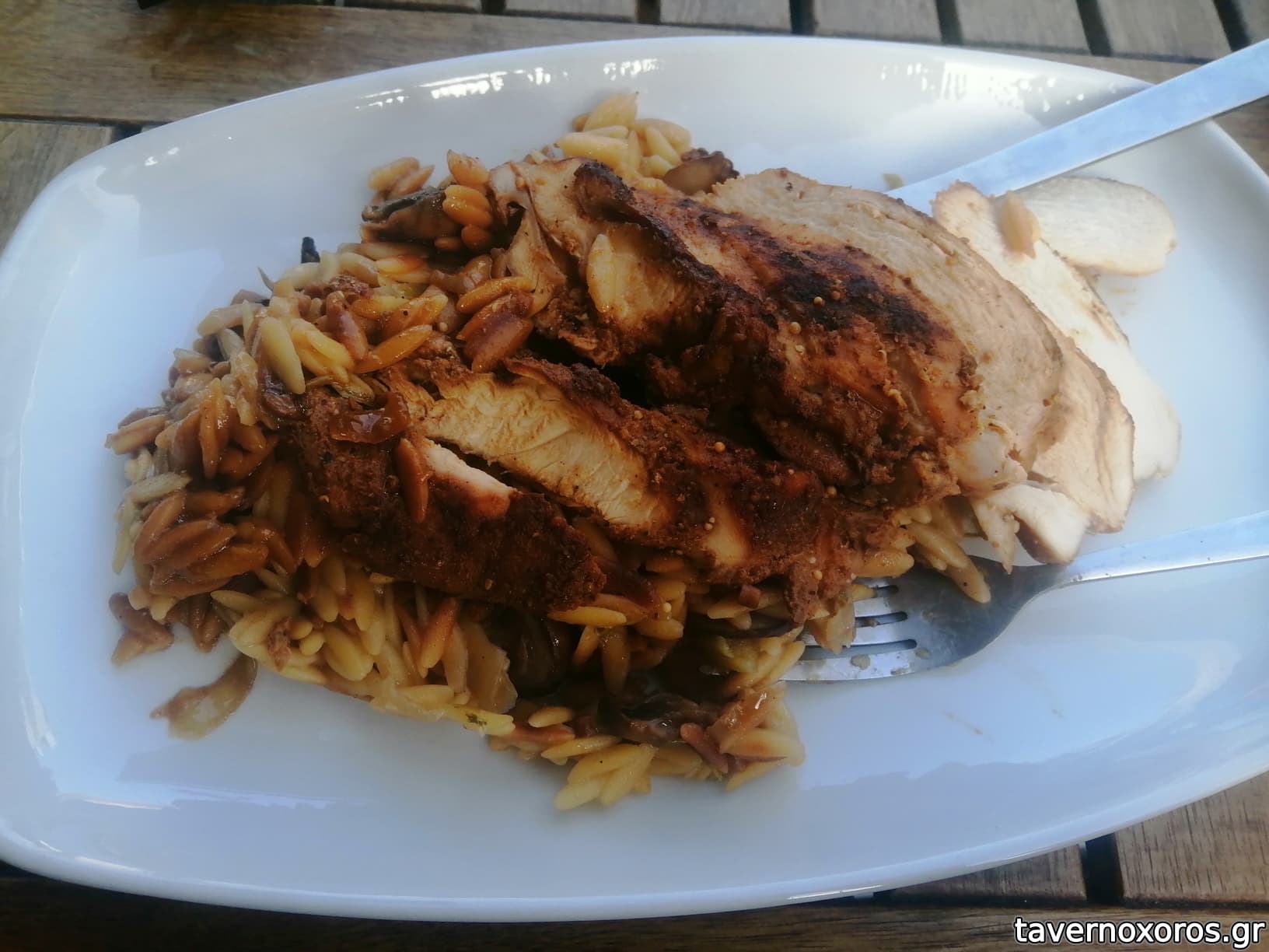 "Ψητό στήθος κοτόπουλο teriyaki με κριθαρότο μανιταριών" (8€, πεντανόστιμο!)