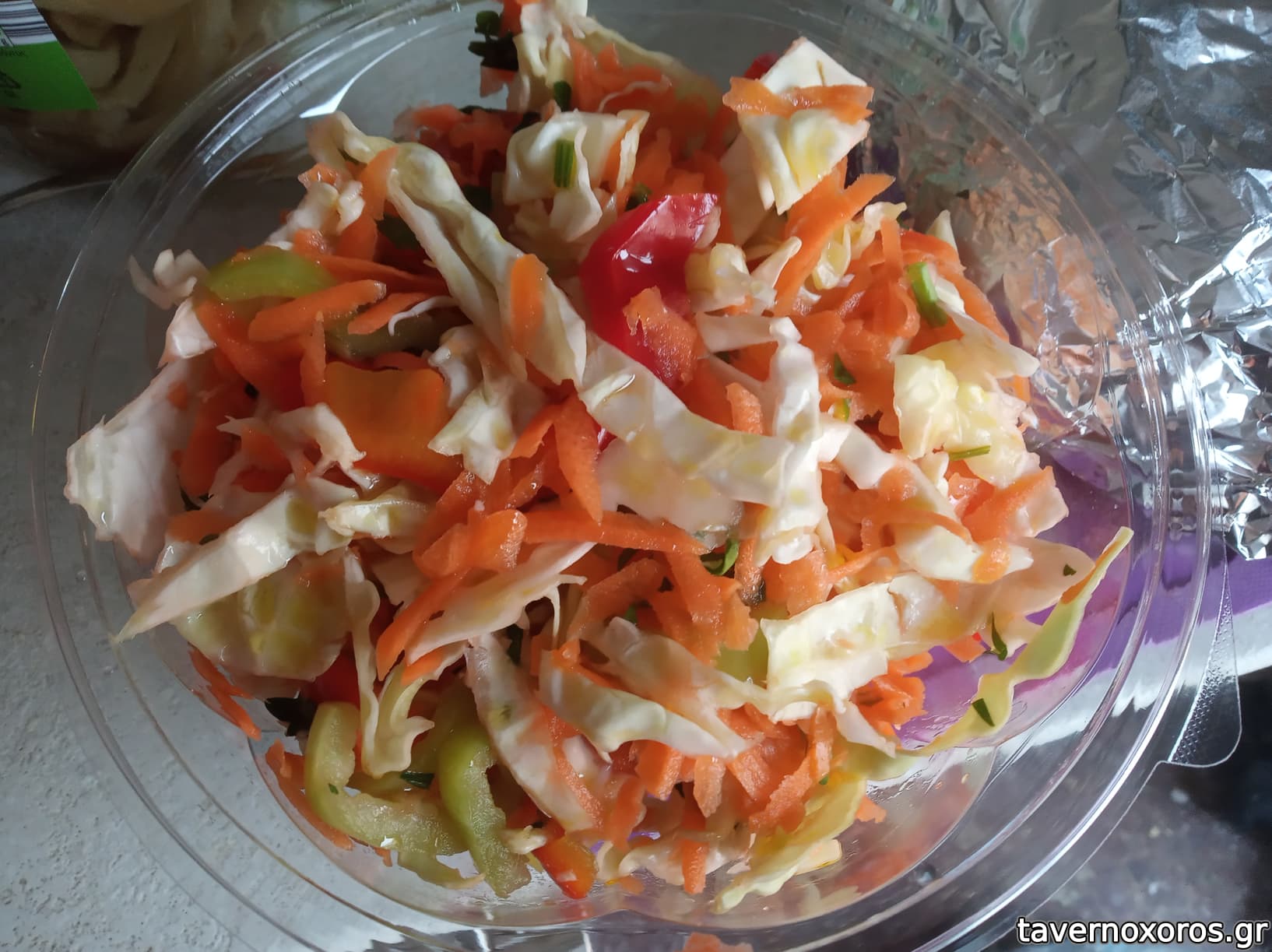 Σαλάτα πικάντικη μεγαλούτσικη, και με πολύχρωμες πιπεριές και καρότο και σέλινα κτλ. κτλ. Λιγότερο λάχανο! Αναπάντεχο, καλή η σαλάτα.