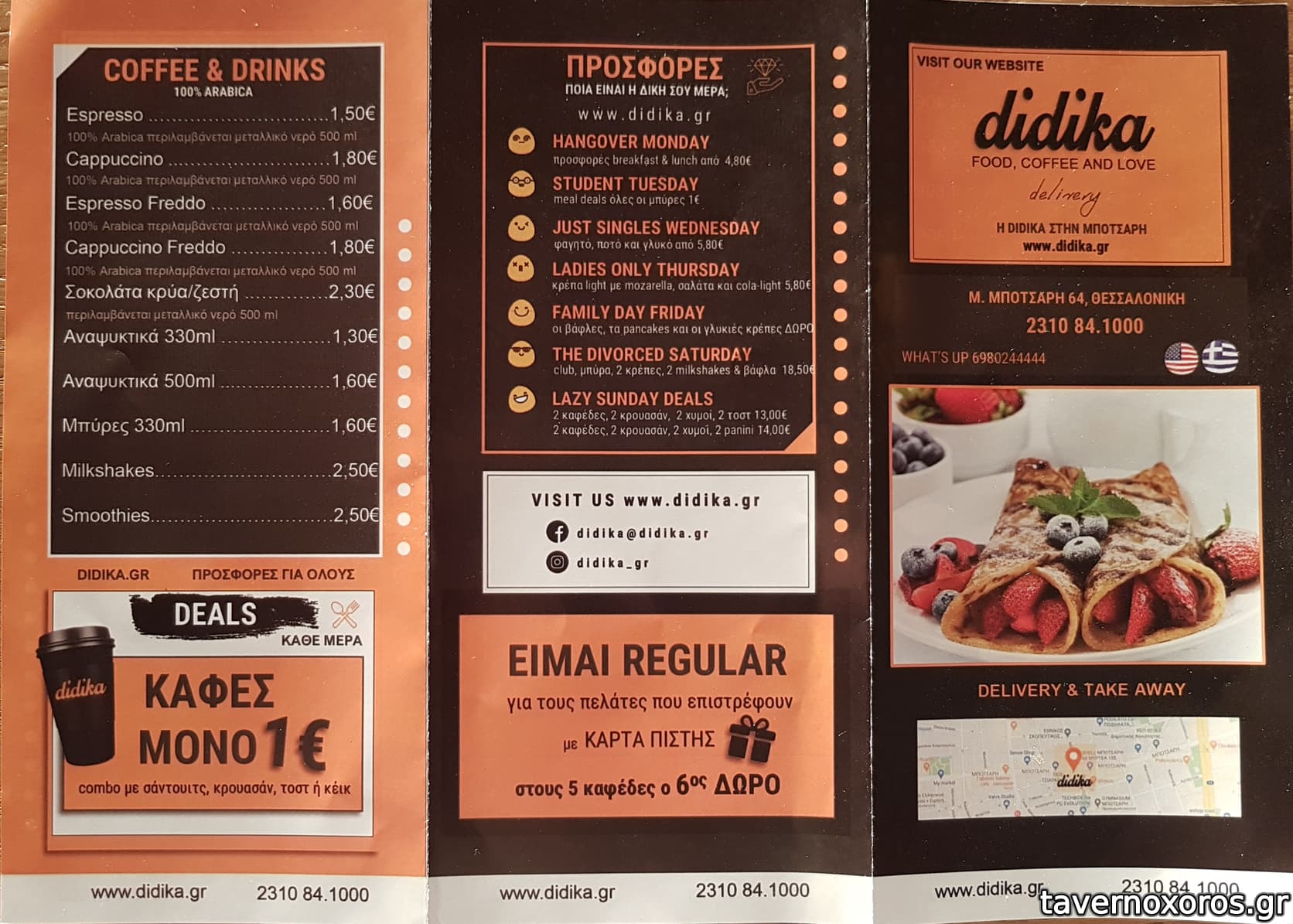 Ηλεκτρονική προσφορά με 1+1 Σαλάτα στα 5€ (Caesar's αρκετά καλές), καθώς και 1+1 Pancakes στα 5€ (Keso Rosso και Bon Bon Banana άνω του μετρίου). Μεγάλος κατάλογος και σίγουρα vfm.