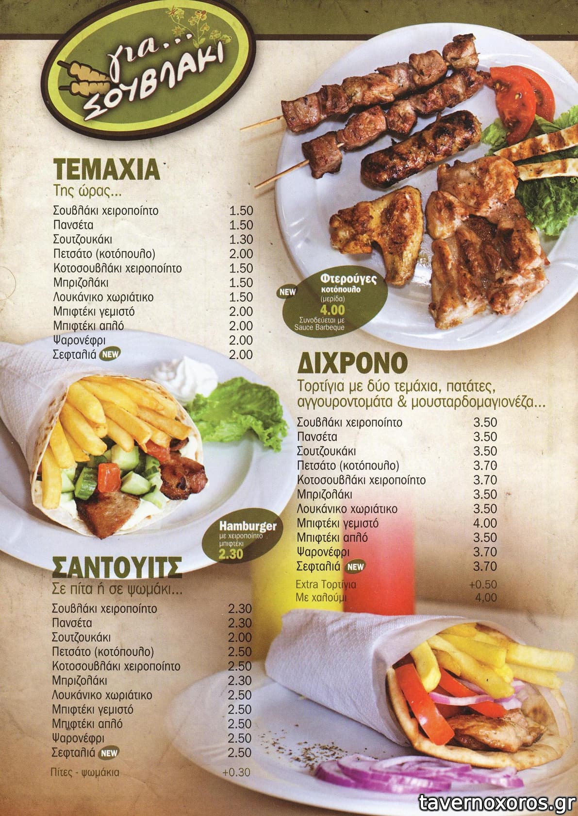Πολύ καλό σουβλάκι και κοτοσουβλάκι αλλά και οι σαλάτες του. Σερβίρει επίσης χαλούμι και μανιτάρι τα οποία επίσης φέρνει σε σουβλάκι, και οι τηγανητές του πατάτες (όχι προκάτ) σερβίρονται σε σέσουλα αντί για πιάτο.