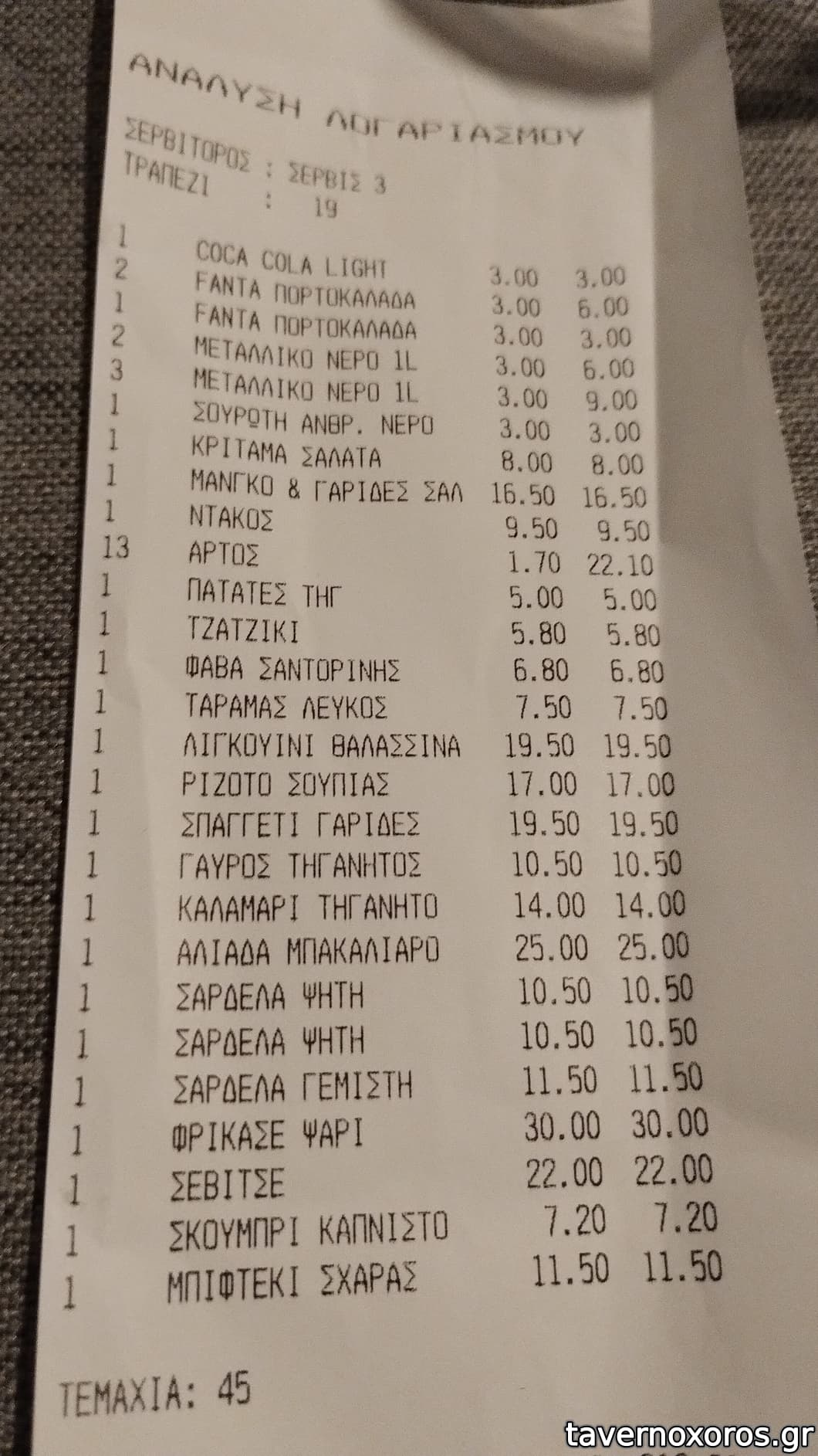 Για όλα τα παραπάνω 156 . Το κρασί συγκράτησα στα 24 ευρώ, καλή τιμή θεωρώ. Γενικά ανέβασε τιμές από τον Μάρτιο που το ξαναεπισκέφθηκα , όπως τα περισσότερα μαγαζιά της εστίασης , λογικό με την αύξηση των τιμών α υλών και ενέργειας. Αξίζει 100 % . Νόστιμο φαγητό , δροσερή αυλή , service γρήγορο και ευγενικό .