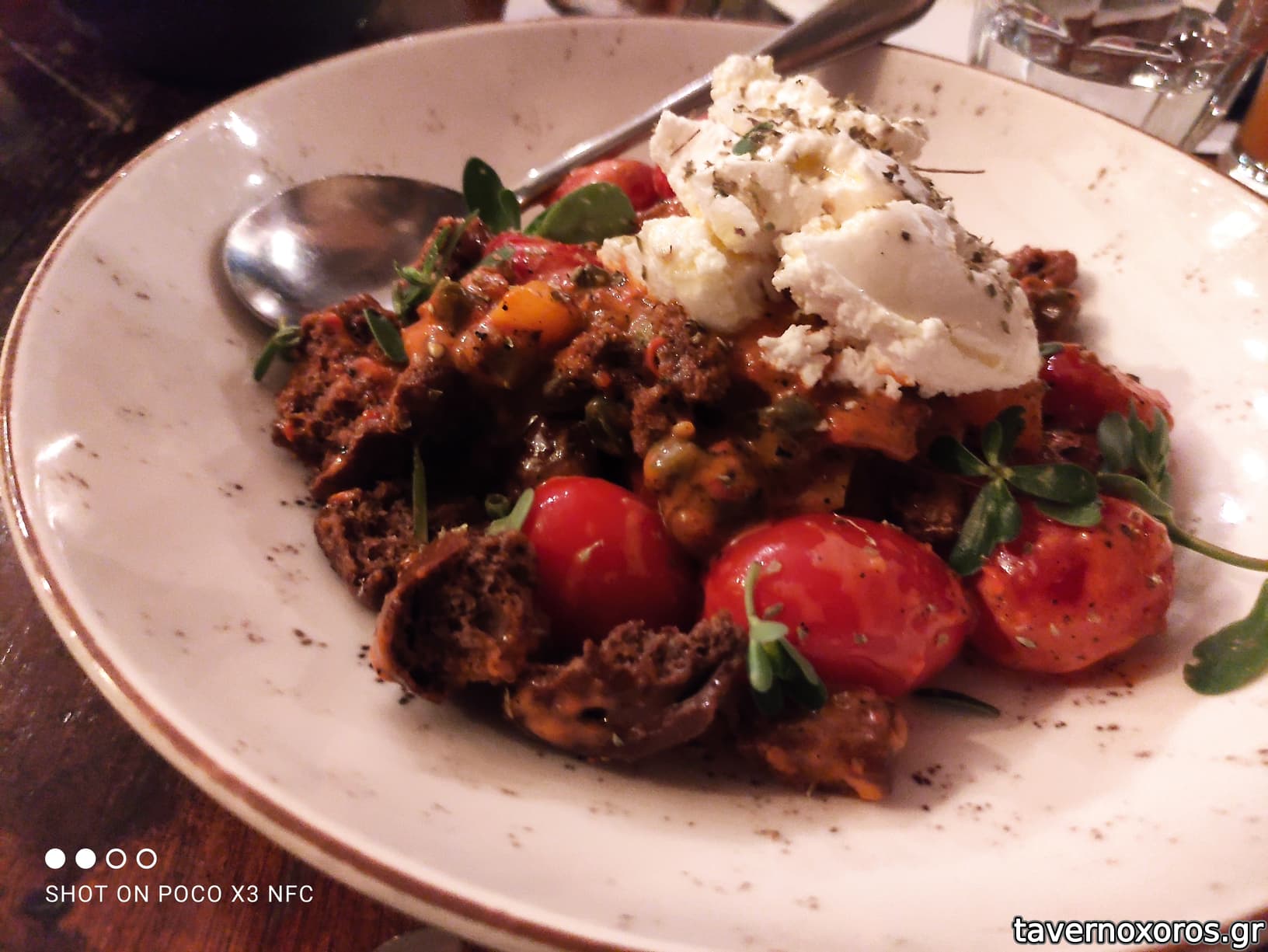 Γαρίδες φρέσκιες με χειροποίητο τραχανά Χίου, τζίντζερ, ντομάτα, φέτα Λέσβου που καπνίζεται στο μαγαζί και κάπαρη με βασιλικό