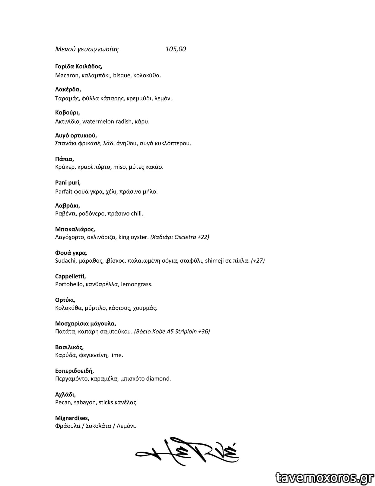 - Έχει μόνο ένα degustation menu με 15+1 στάδια. Δεν έχει α λα καρτ.