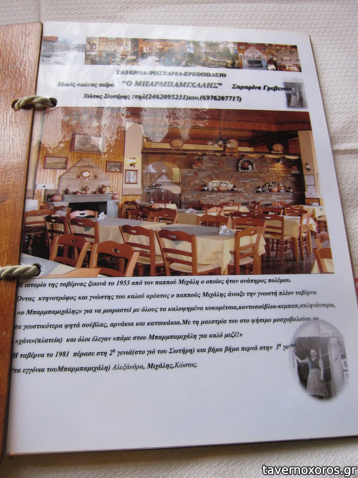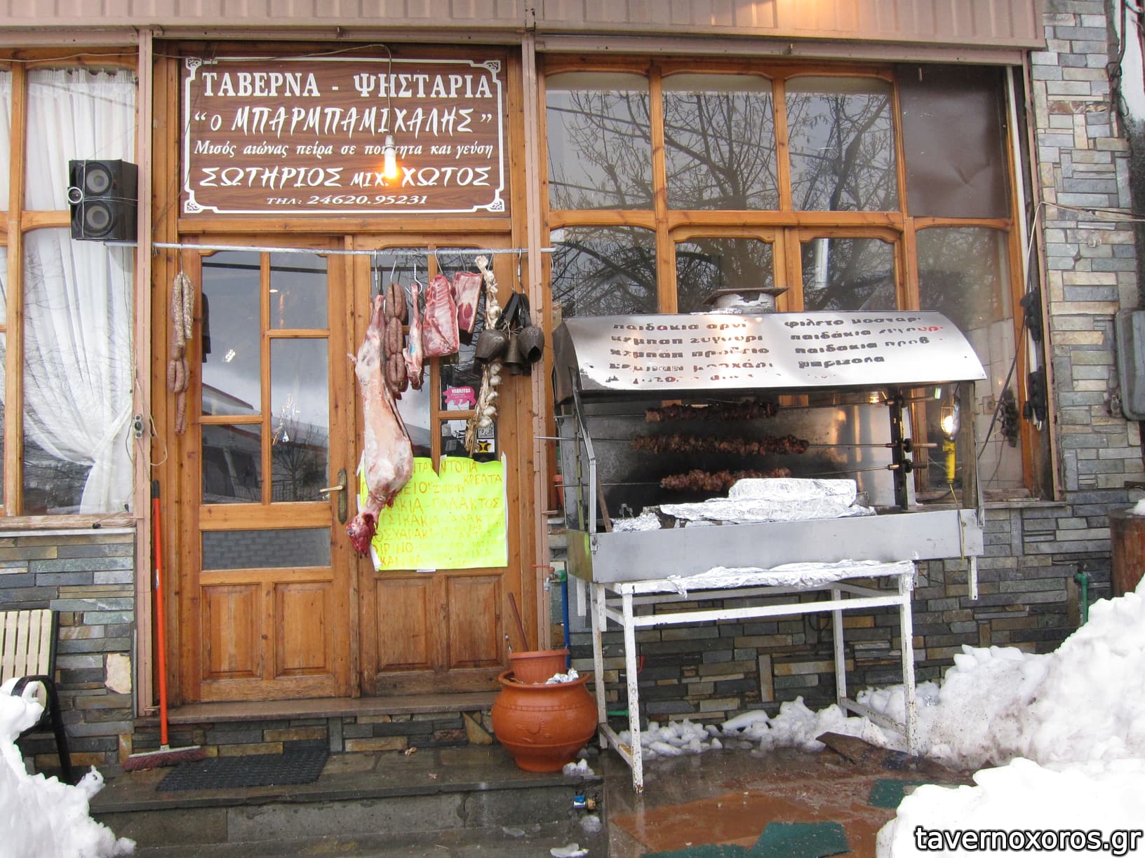 | Λέξεις κλειδιά | Μπάρμπα Μιχάλης, #χασαποταβέρνα, #τζάκι, #tv, #μπρικέτα, #σούβλες, #κεμπάπ, #προβατίνα, #αρνάκι, #κατσικάκι, #ζυγούρι, #πρόβειο, #αρνί, #κοκορέτσι, #σπληνάντερο, #κοτόπουλα σούβλας, #παϊδάκια, #λουκάνικο, #μπιφτέκι, #χοιρινή, #μοσχαρίσια μπριζόλα, #πανσέτα, #πρόβειο παϊδάκι, #αγριογούρουνο, #στιφάδο αγριογούρουνο, #λαγός στιφάδο, #ζαρκάδι, #πέρδικα, #πέστροφα, #χταπόδι, #μπακαλιάρος, #νιβατό, #ανεβατό, #μπάτζος, #ομελέτα, #σπεντζοφάι, #κολοκυθοκεφτέδες, #μανιτάρια, #μελιτζάνα τηγανητή, #πιπεριές, #κολοκυθάκια, #κρεμμυδοκεφτέδες, #βραστό, #τραχανάς, #γίδα βραστή, #κεφτεδάκια, #λαδερά, #φασολάκια, #μπάμιες, #κοκκινιστό, #μουσακάς, #φασόλια γίγαντες, #παστίτσιο, #μακαρονάδες, #παπουτσάκια, #φασολάδα, #σουτζουκάκια σμυρνέικα, #πίτες, #μελιτζανόπιτα, #γαλατόπιτα, #γλυκά του κουταλιού |