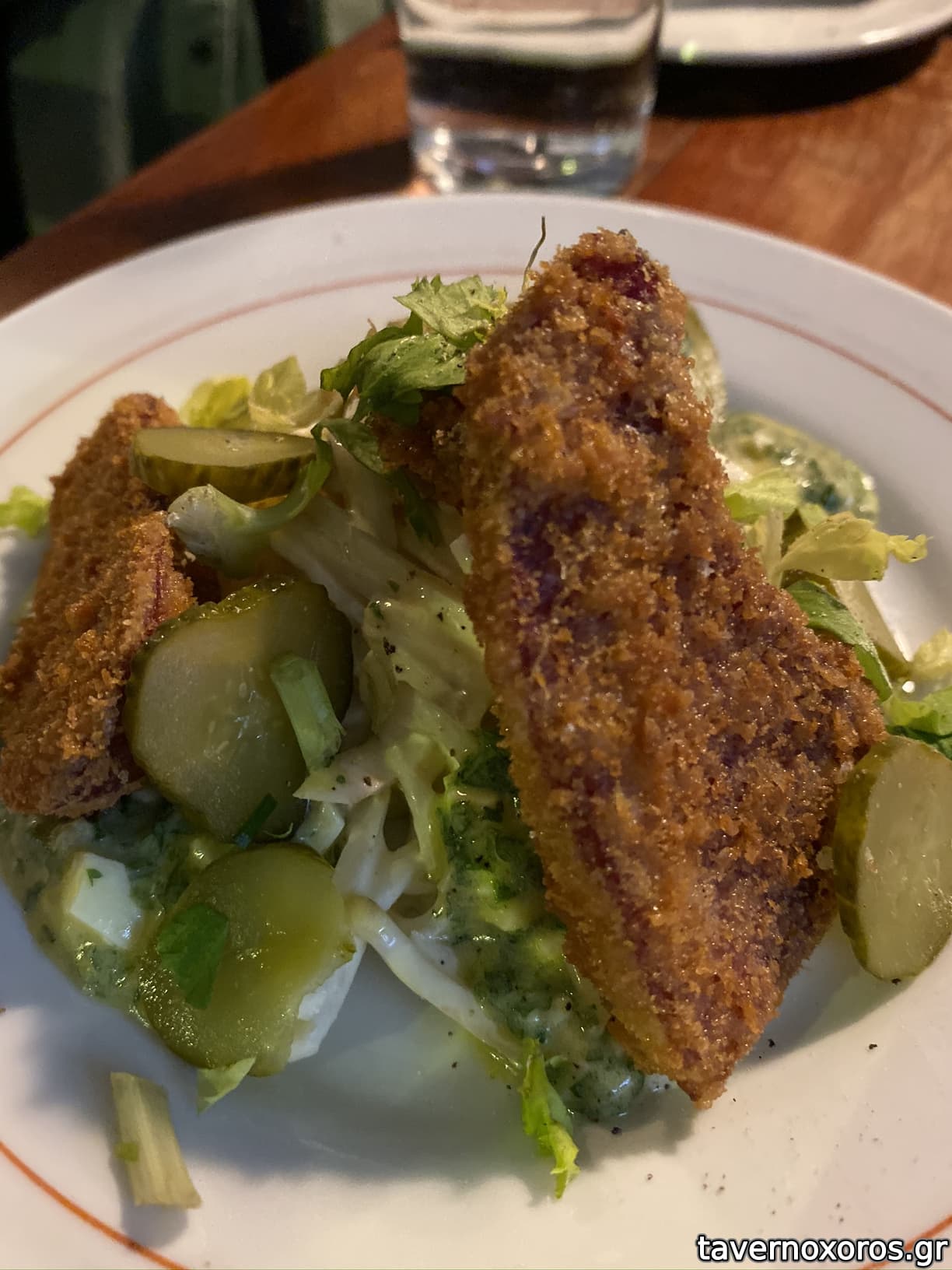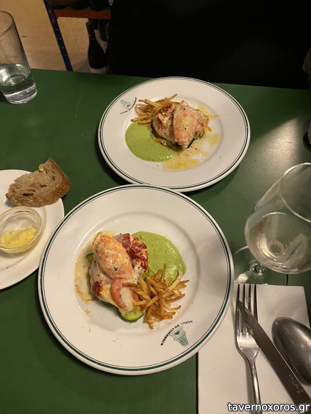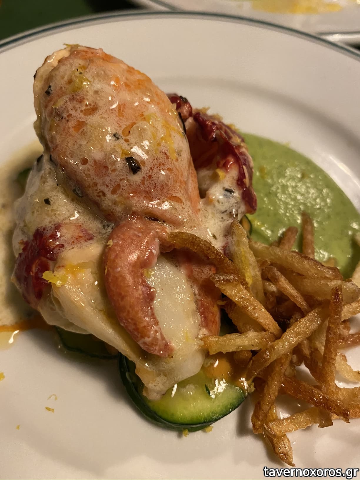 Αστακός με πατάτα τηγανητή και κολοκυθάκια τουρσί