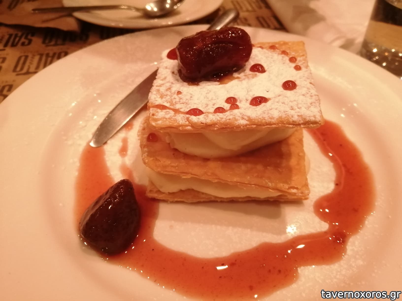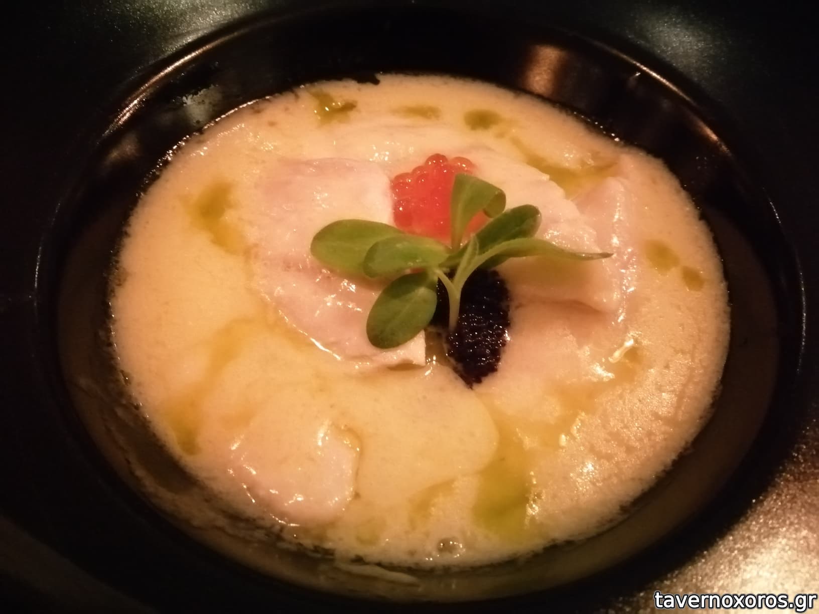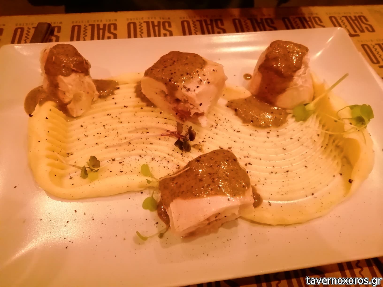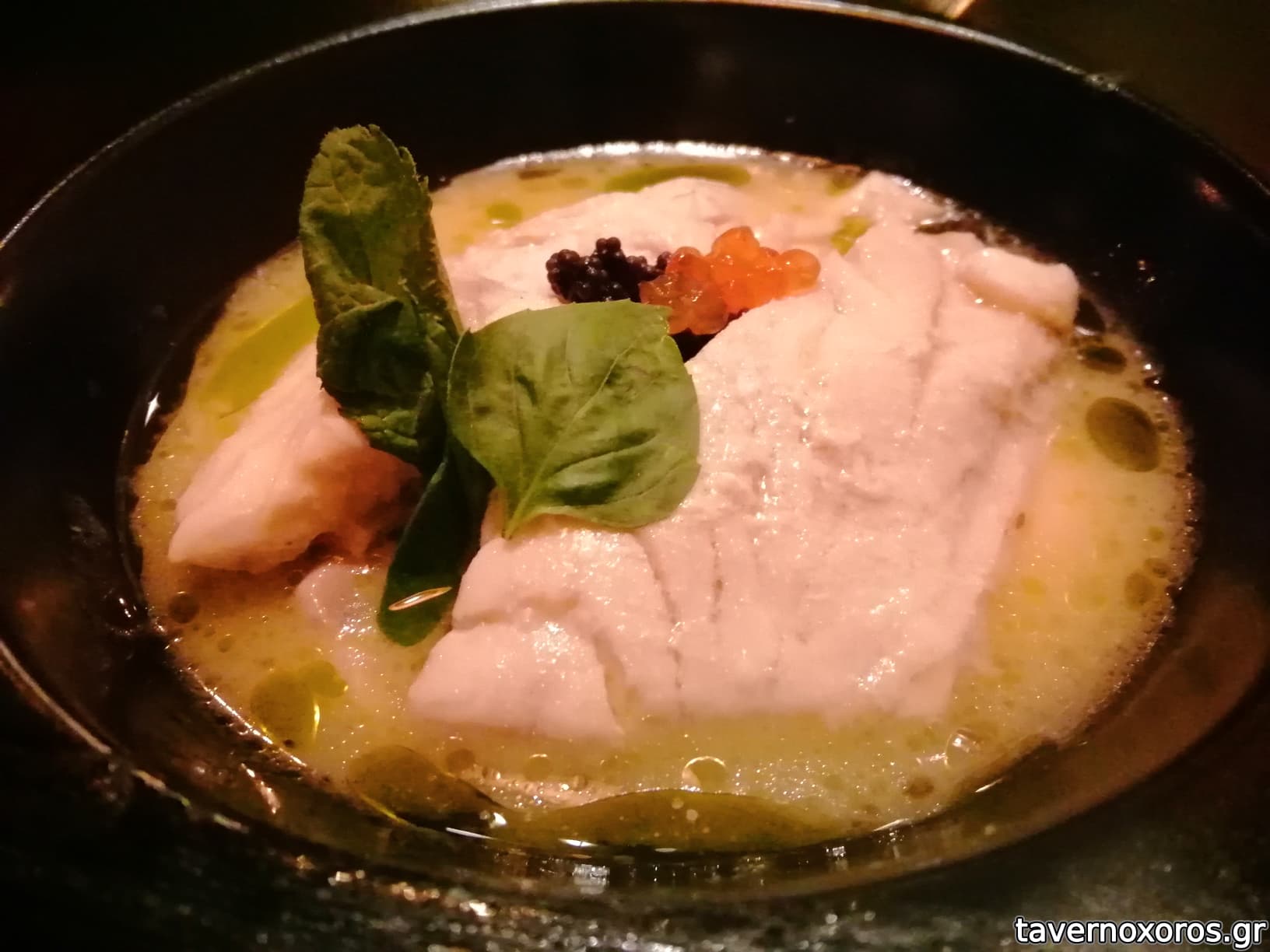 "Φιλέτο λαυράκι, πουρές σεληνόριζας και beurre blanc από μαύρο και κόκκινο χαβιάρι" (πολύ καλό)