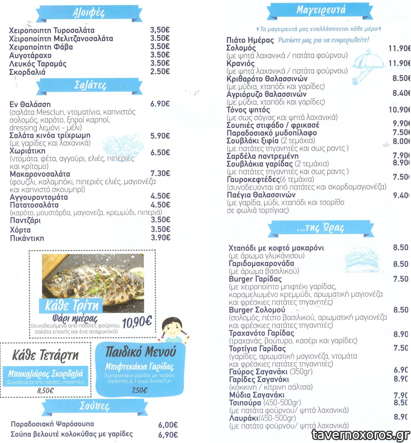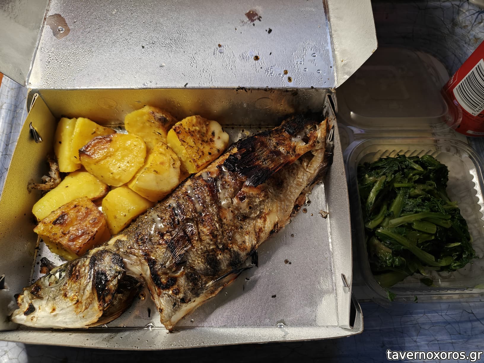 Λαβράκι ψητό με πατάτες φούρνου, σαλάτα εποχής (χόρτα) και αναψυκτικό.