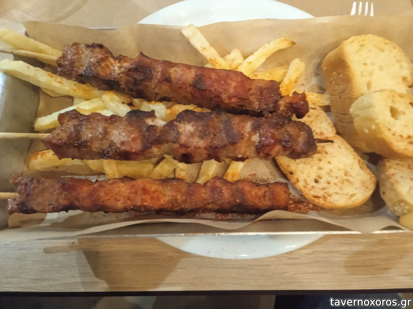 Μοδάτο ψητοπωλείο με τρέντι ντεκόρ και νεανική πελατεία. Προσωπικό με στολή, καπέλο κλπ, παραγγελία μέσω pda. Μεγάλος κατάλογος (γύρος, σουβλάκια, μπέργκερ, χοτ ντογκ, κλαμπ, σαλάτες κλπ.) γραμμένος σε αθηναϊκή διάλεκτο. Μουσική βασανιστική (Οικονομόπουλος, Βέρτης κλπ.) και δυνατή (σε ενοχλητική ένταση). Κάθησα εκεί μόνο και μόνο λόγω επιλογής των υπολοίπων της παρέας, που απέρριψαν τον Μπέσιο. Παρήγγειλα 3 χοιρινά «καλαμάκια» (ή σουβλάκια στην βόρεια διάλεκτο), τα οποία συνοδεύονταν από λίγες φρέσκιες τηγανητές πατάτες και ψωμάκι. Τα σουβλάκια ήταν επιεικώς απαράδεκτα, άνοστα, ξεραμένα, στεγνά, προψημένα πριν ώρα και μισοξαναζεσταμένα (βλ. φωτο). Κρασί χύμα κακό, δεν ικανοποίησε. Τιμή για το σουβλάκι 2,60 € το τεμάχιο (Μάιος 2023).