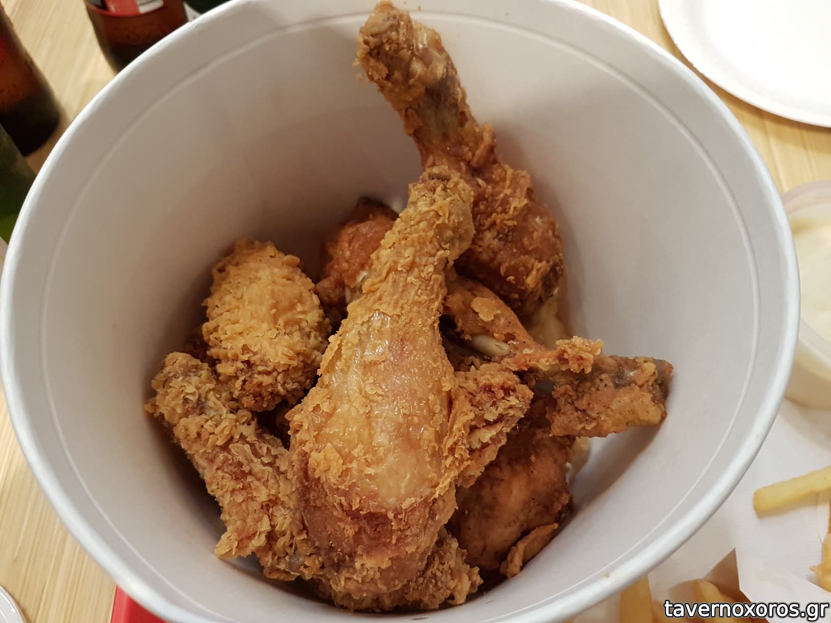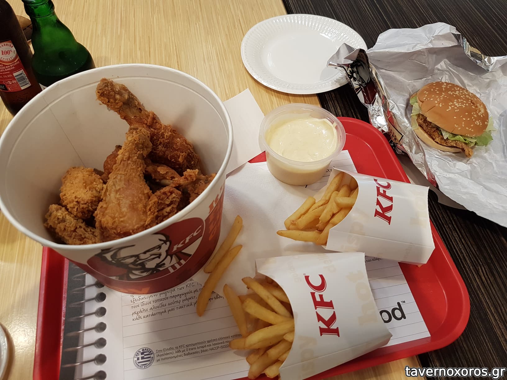 Δοκιμάσαμε 3 άτομα το menu με τον μεγάλο κουβά που έχει 15 μέτρια κομμάτια τεμαχισμένο τηγανιτό κοτόπουλο, τηγανιτές πατάτες,