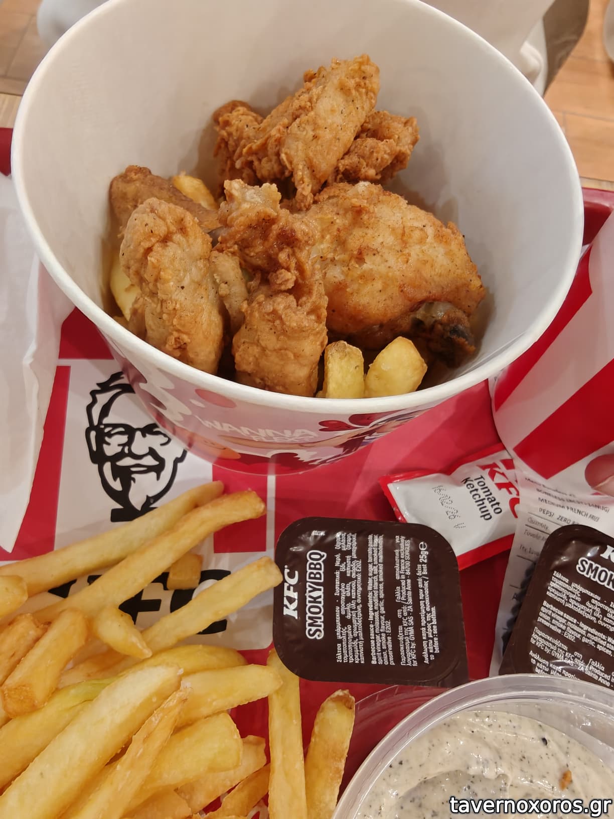 "Smart bucket": 2 Hot Wings, 2 Crispy Strips, 2 Chicken On The Bone, 2 Hot Legs (καλή περίπτωση αν είστε 2 και θέλετε να δοκιμάσετε τα διάφορα είδη)