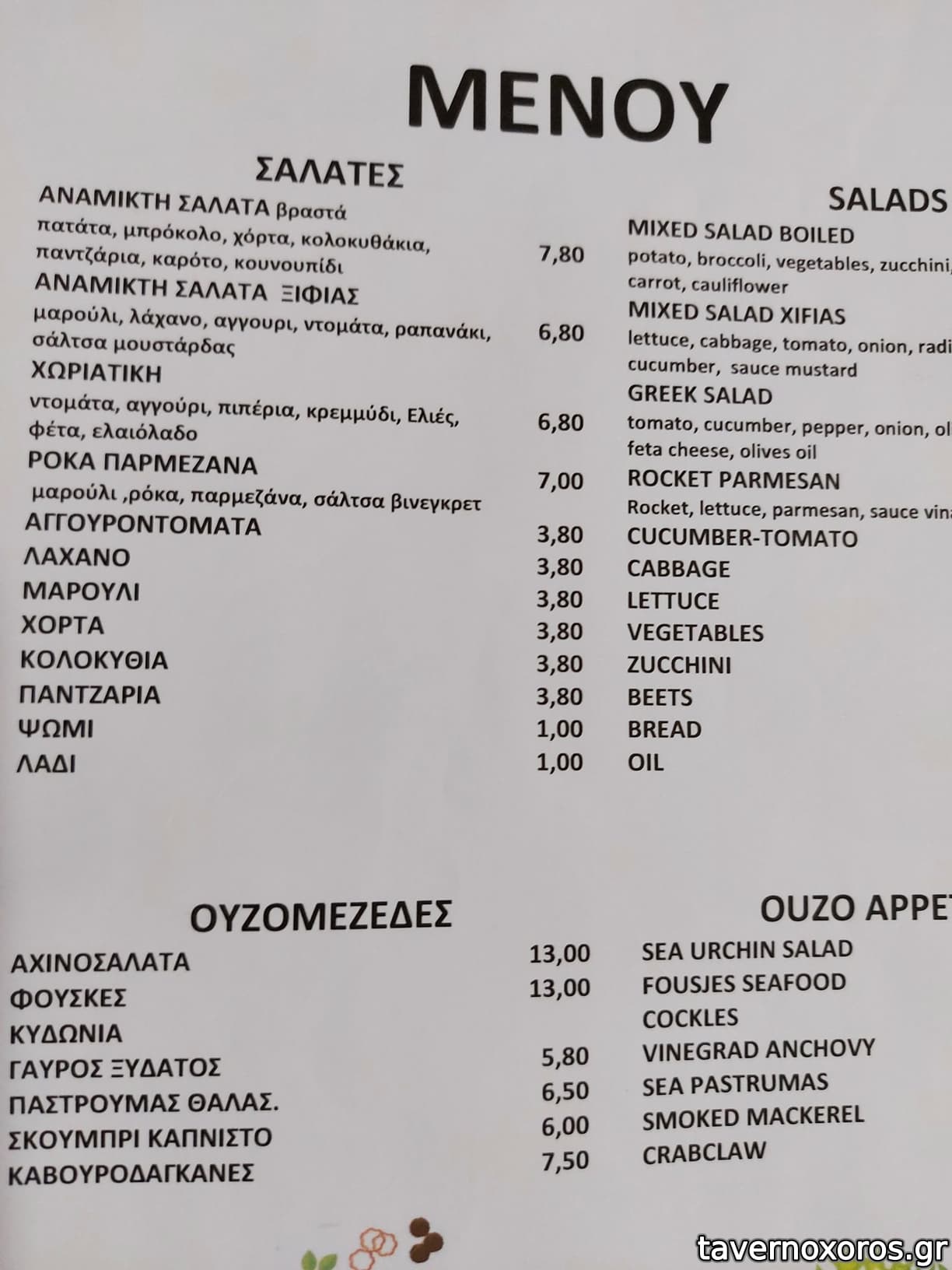 Κέρασμα μελιτζανοσαλάτα καπνιστή και ξυδάτη (έπαιξε και παραγγελία μερίδα), πατάτα χεράτη (πολύ καλή), κολοκυθάκι τηγανητό σε ροδέλες (ωραίο τηγάνι), χόρτα (οκ), αθερίνα (οκ), σαρδέλα παντρεμένη (εξαιρετική), καλαμαράκι τηγανητό (ωραίο).
