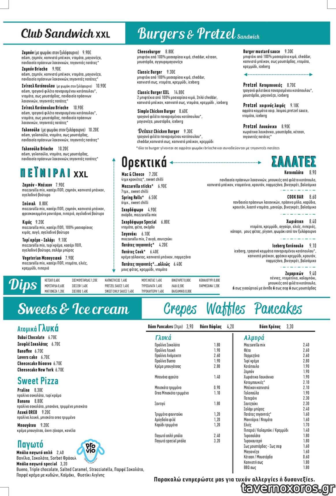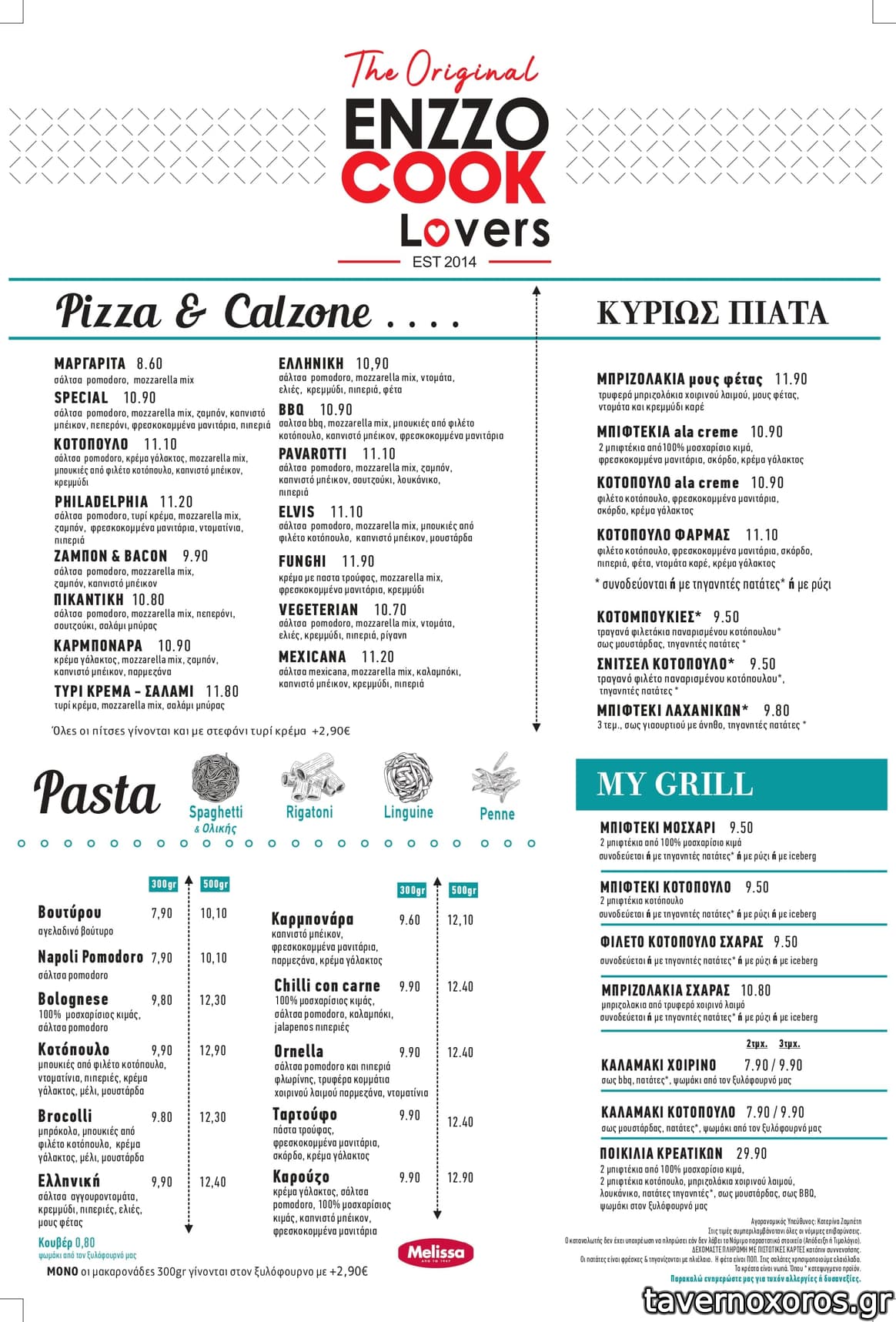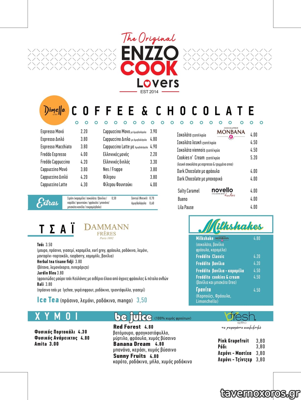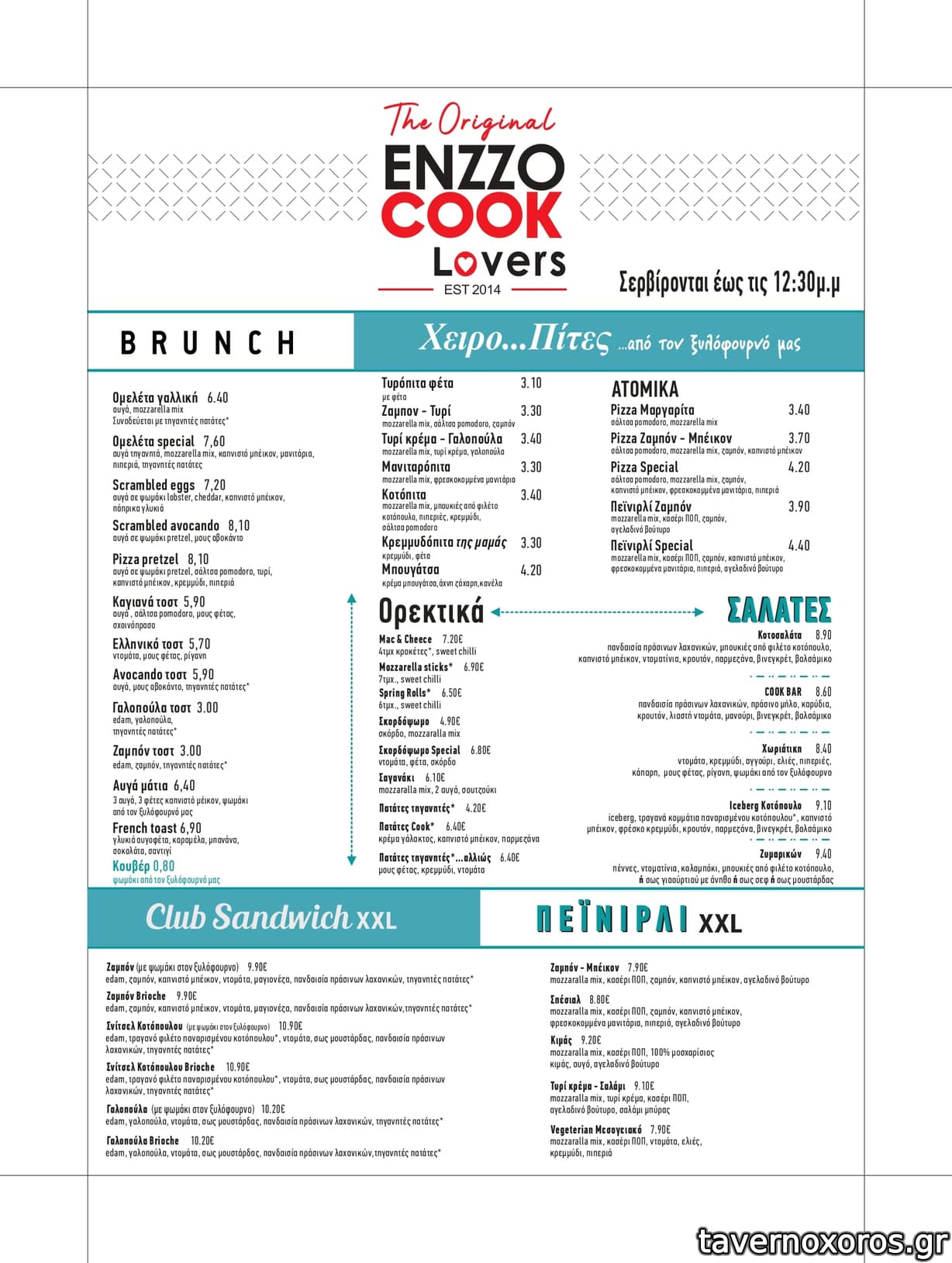 | Λέξεις κλειδιά | Ένζο, #cafe, #κρέπες, #χυμοί, #τσάι, #pretzel, #ξυλόφουρνος, #πίτες, #ομελέτα, #πεϊνιρλί, #club sandwich, #καλτσόνε, #ζυμαρικά, #μακαρονάδες, #μπιφτέκι, #χοιρινή, #κοτόπουλο, #σνίτσελ, #σουβλάκια, #burgers |