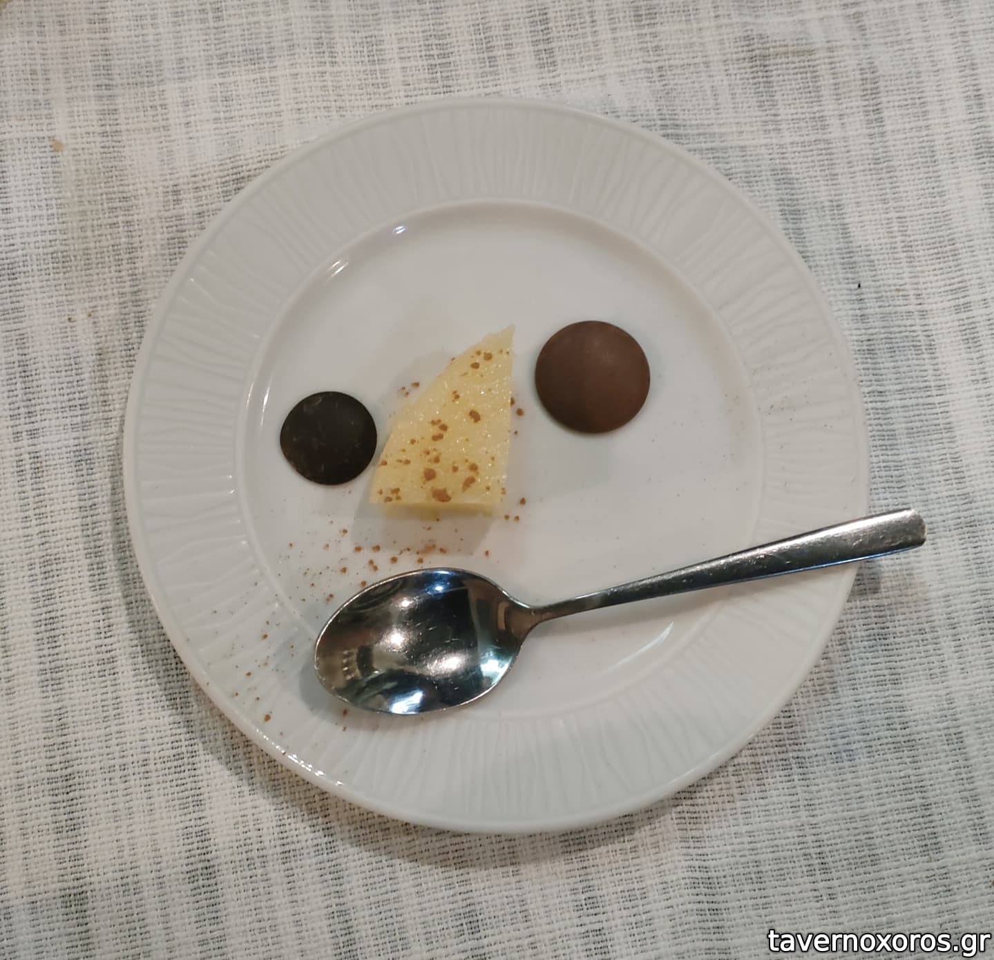 Cheesecake , μπάρα σοκολάτας και χαλβάς σιμιγδαλένιος σε στυλ mignardise x 6 τμχ . Αρκετά νόστιμα, κυρίως ο χαλβάς .