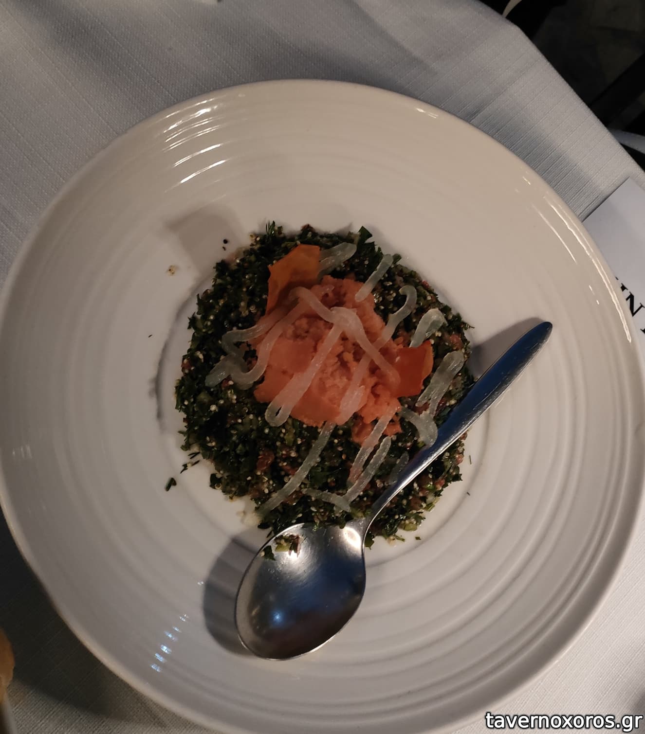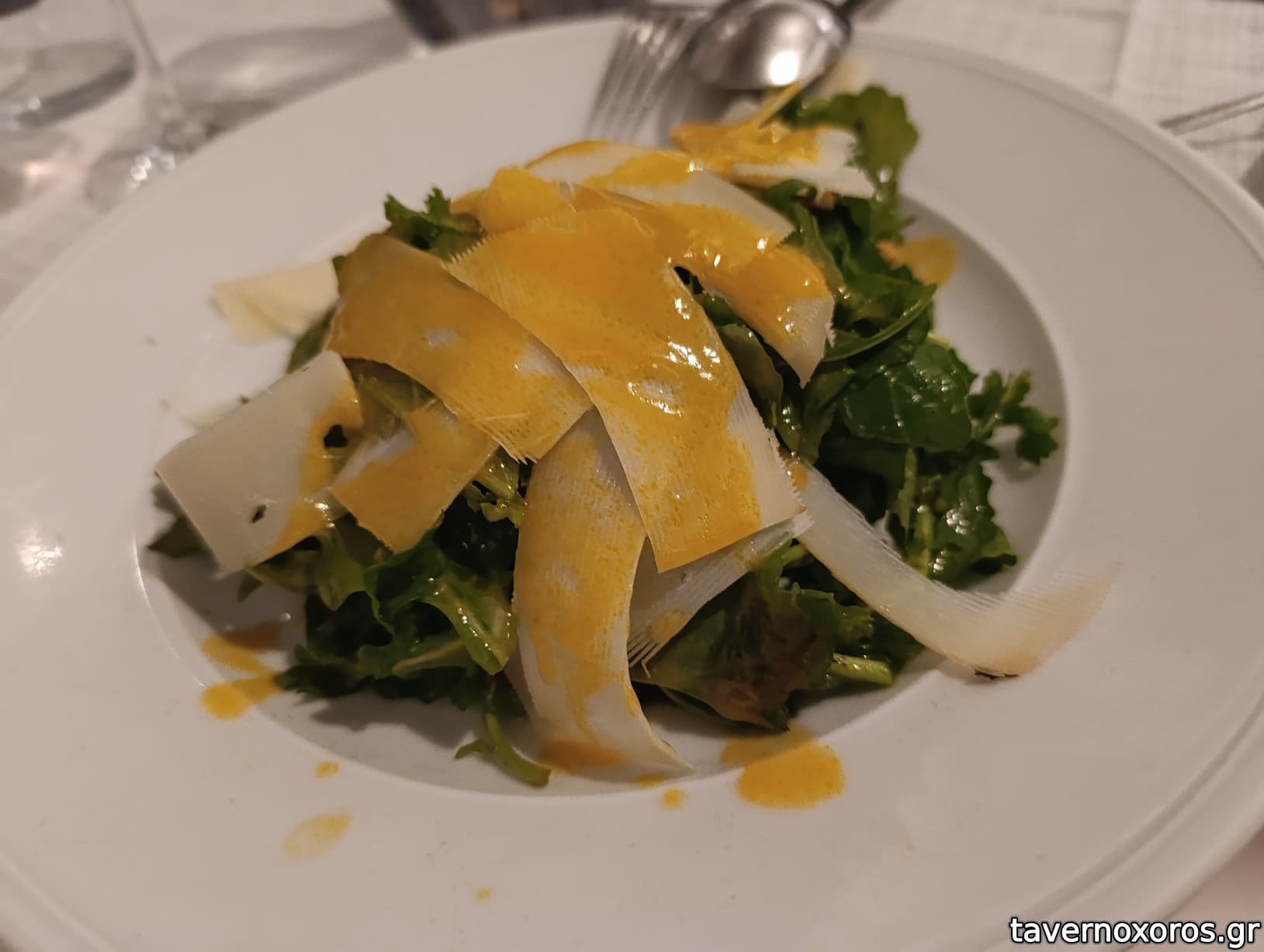 2. Σαλάτα σέσκουλα με βολάκι Άνδρου και χειροποίητο φύλλο " σπασμένο " στα 10 €. Καλή
