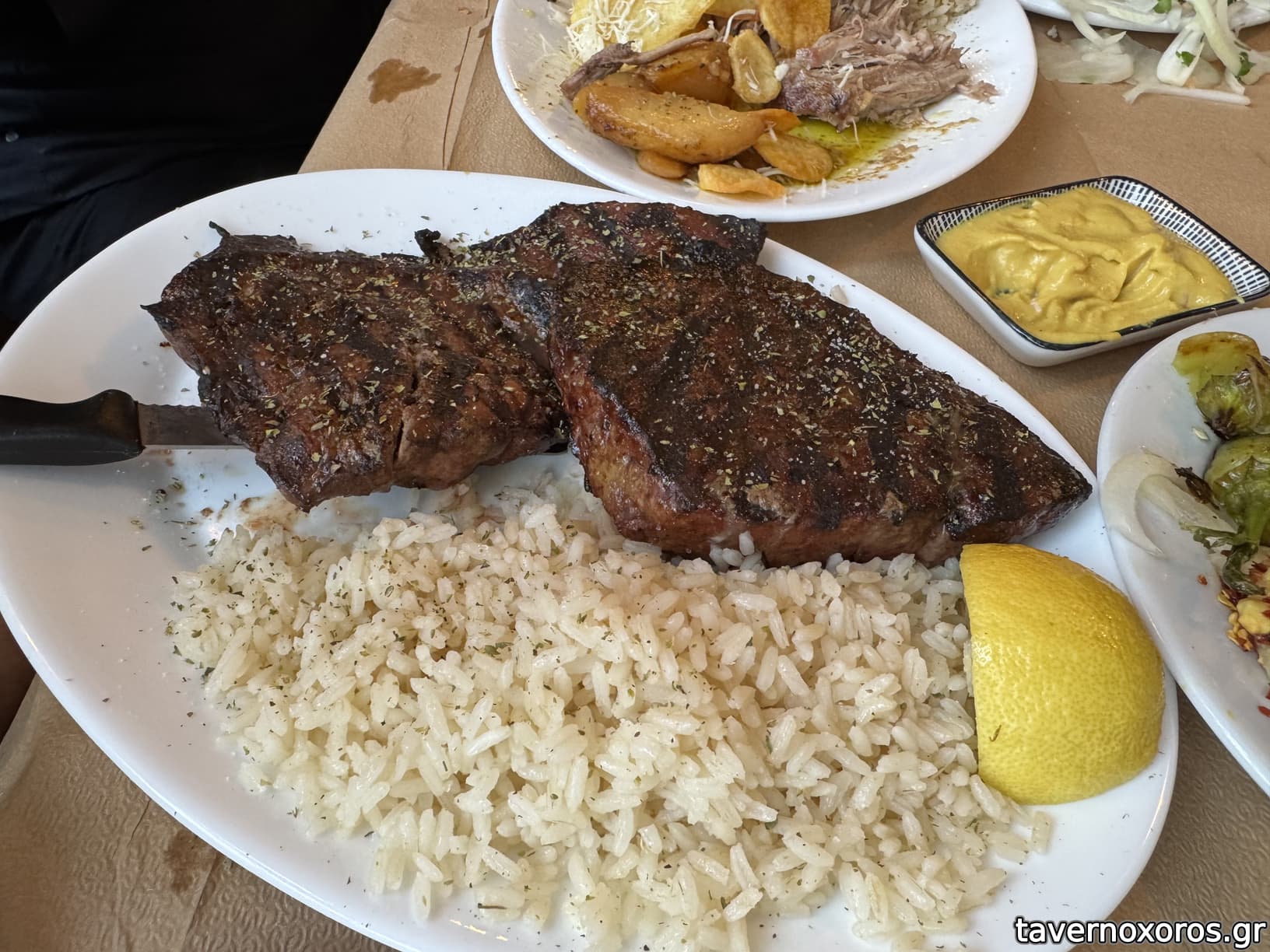 Η μοσχαρίσια μπριζόλα ζουμερότατη και ομοιόμορφα καλοψημένη με συνοδευτικό ριζάκι στα πρόθυρα του παραβρασμένου, αλλά ακόμη σπυρωτό (όπως ακριβώς πρέπει!).