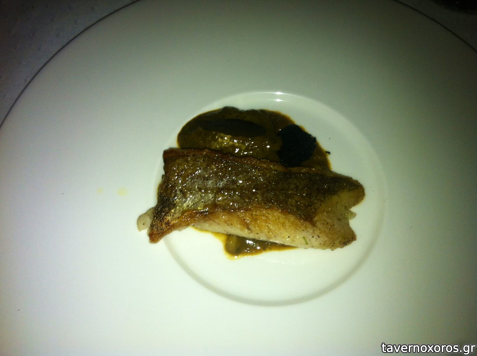 Degustation menu των 85€, πιάτο 6/10: "λαβράκι a la plancha (παραλλαγή σε ένα κερκυραϊκό τσιγαρέλι)" (το λαβράκι σωστά ψημένο, το τσιγαρέλι όμως αρκετά κακό)