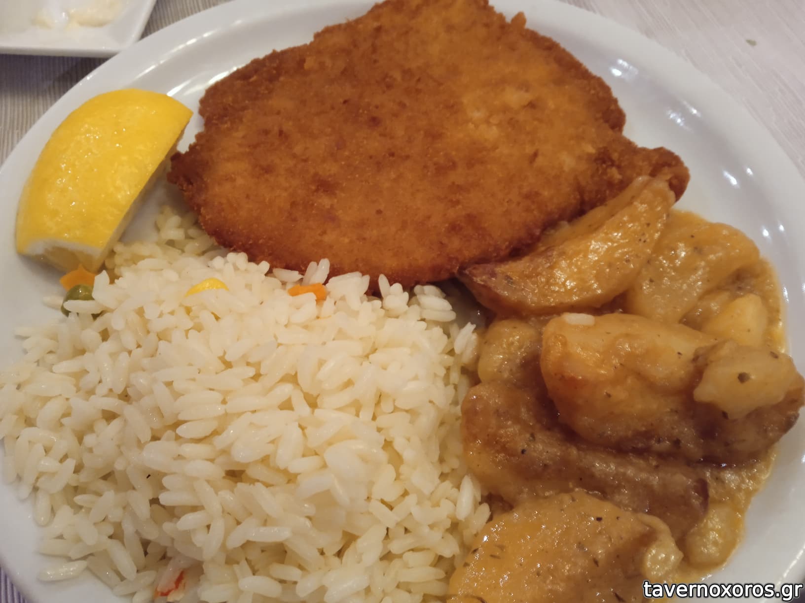 Σνίτσελ χοιρινό με πατάτες φούρνου και ρύζι