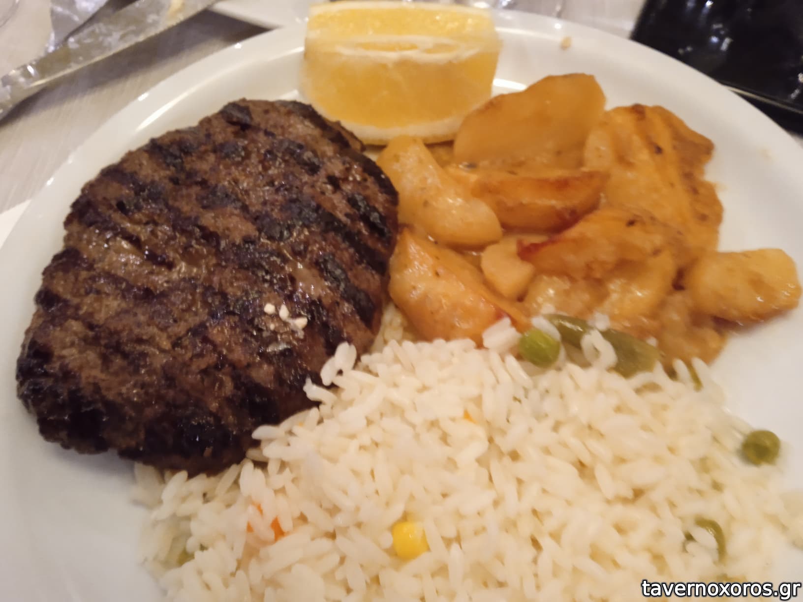 Μπιφτέκι μόσχου με πατάτες φούρνου και ρύζι