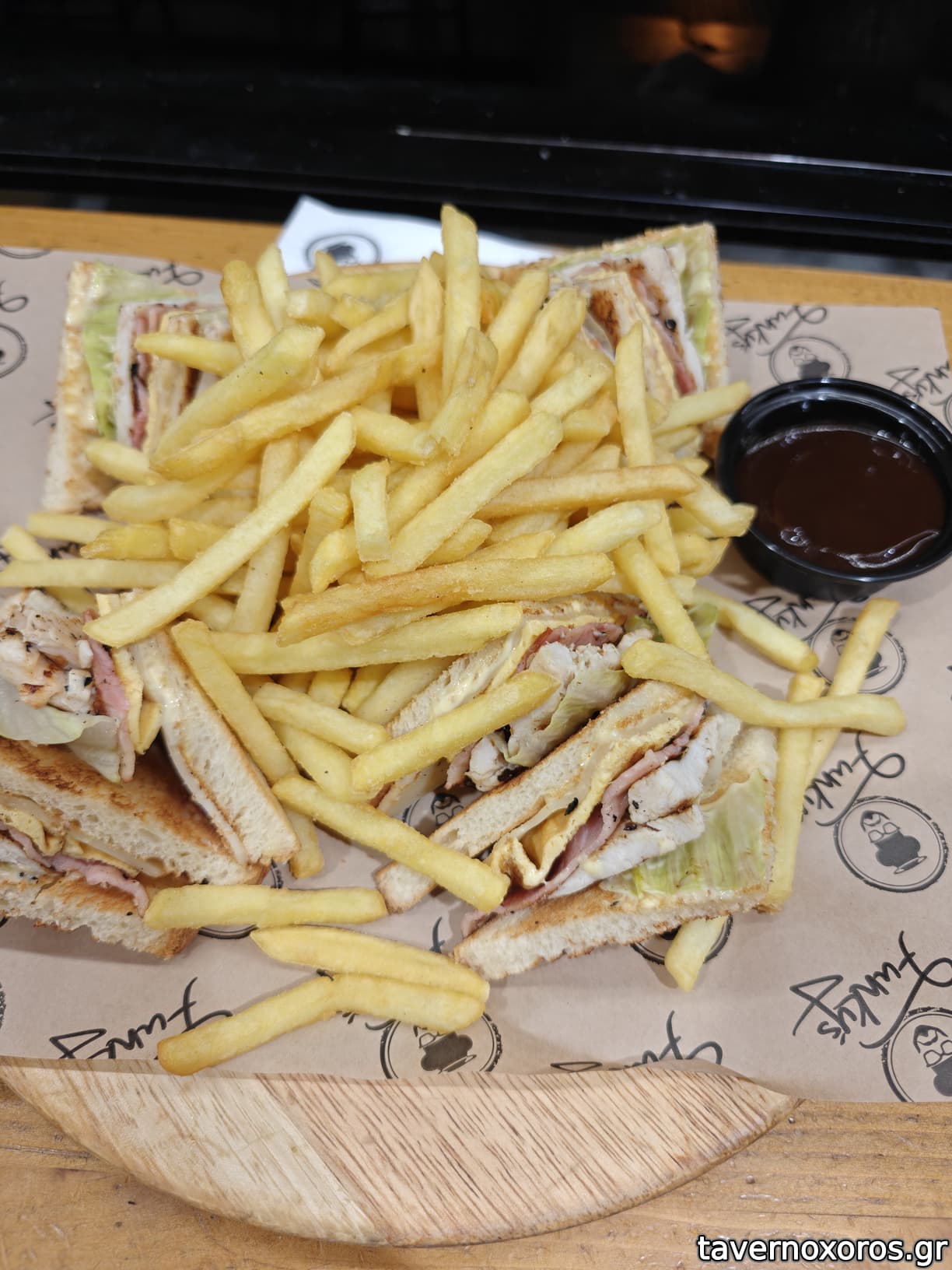 Club sandwich με φιλέτο κοτόπουλο (καλό), πατάτες προκάτ τύπου goody's (ψιλοαδιάφορες)
