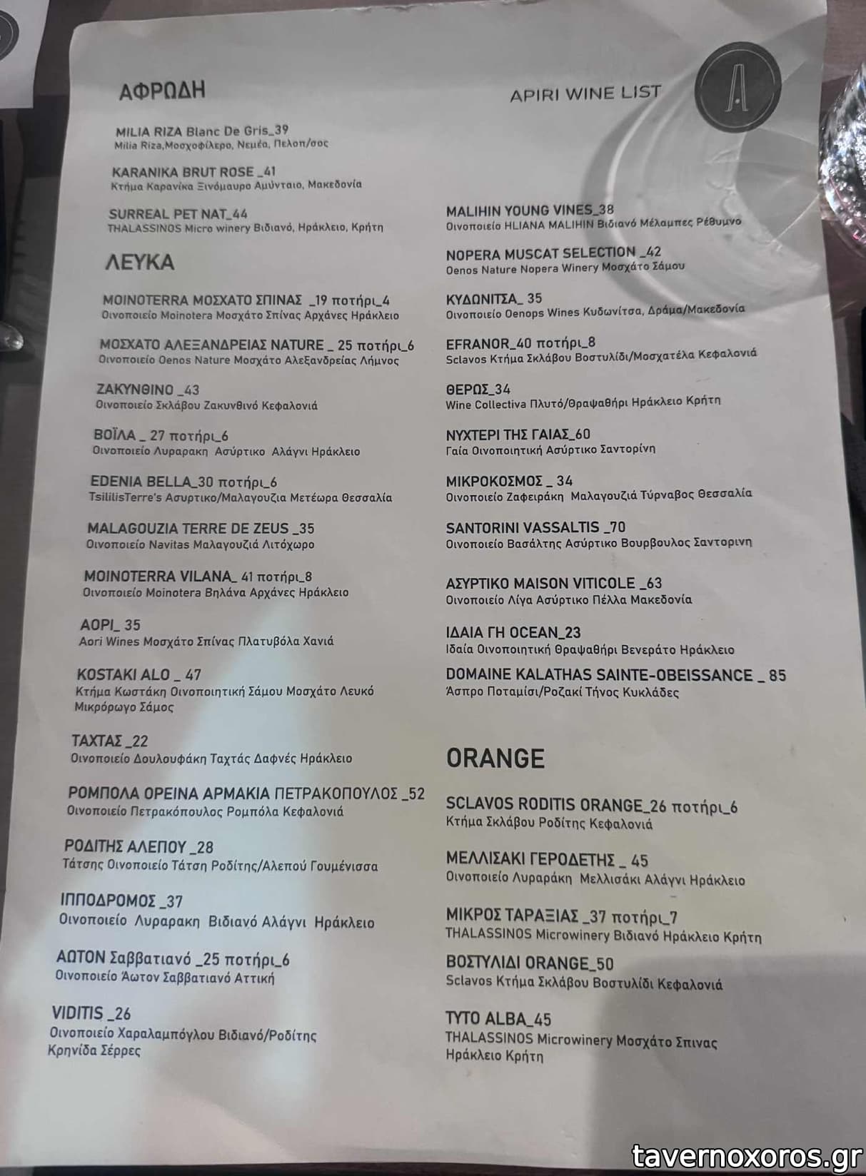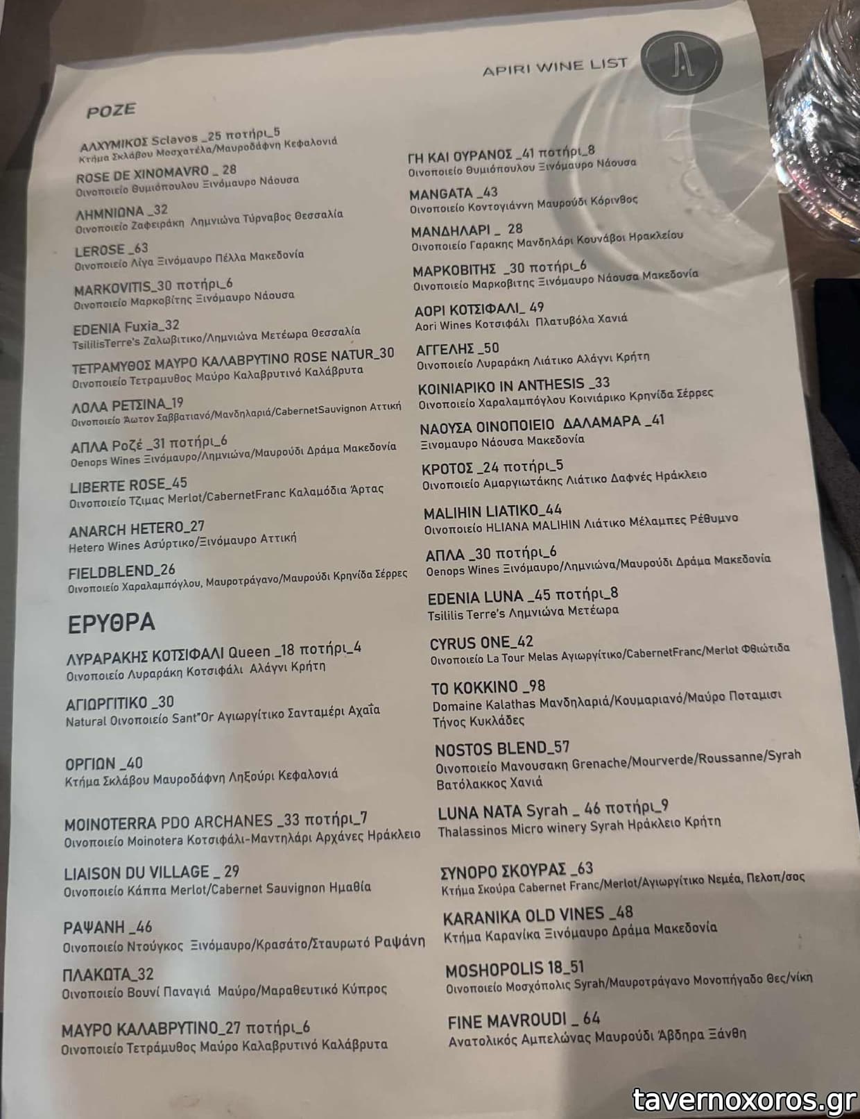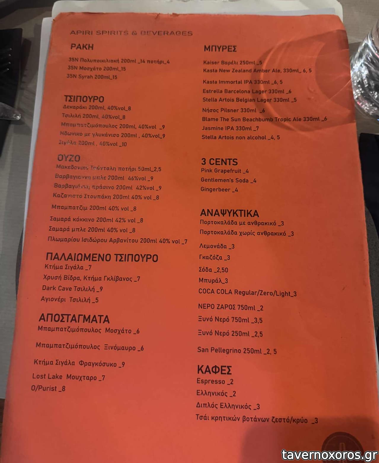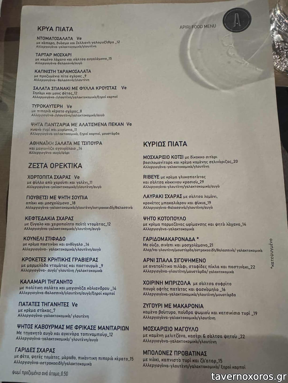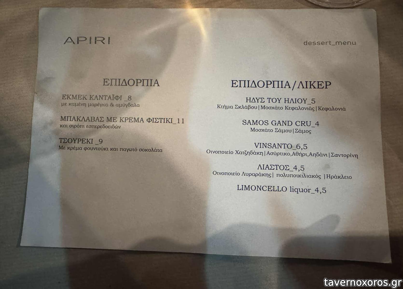 Στα του φαγητού, το Απίρι ξεχωρίζει, τουλάχιστον στο δημιουργικό κομμάτι, από την πλειοψηφία των εστιατορίων του Ηρακλείου (και της ευρύτερης περιοχής). Παραμένει βέβαια σε χαμηλότερα επίπεδα από τα αντίστοιχα της Αθήνας και της Θεσσαλονίκης. Από αυτά που δοκιμάσαμε ξεχώρισε με διαφορά το πιάτο με τον καβουρμά, ο οποίος ήταν πολύ καλός, δικής τους παραγωγής. Πολύ καλός ήταν και ο συνδυασμός αρνί-πιλάφι-σταφίδες πίκλα. Ο κατάλογος γράφει ότι το πιάτο αυτό συνοδεύεται από παστινάκι (υποθέτω πουρέ). Όταν το δοκιμάσαμε ήμασταν σκεπτικοί για το αν είναι παστινάκι και όταν ρωτήσαμε μας είπαν ότι είναι πουρές μπρόκολου (και μάλιστα ότι δεν είναι από τα αγαπημένα της σερβιτόρας). Θα μπορούσαν να μας είχαν ενημερώσει εκ των προτέρων για την αλλαγή.