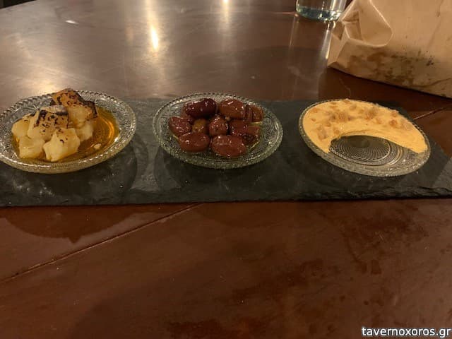 1 καλωσόρισμα με αρσενικό Νάξου σε λάδι από τσίλι, 1 βούτυρο καπνιστό με δέρμα από χοιρινό, ελιές στο ξύλο με 15 μυρωδικά, ψωμί στο ξύλο με λάδι, εξαιρετικό
