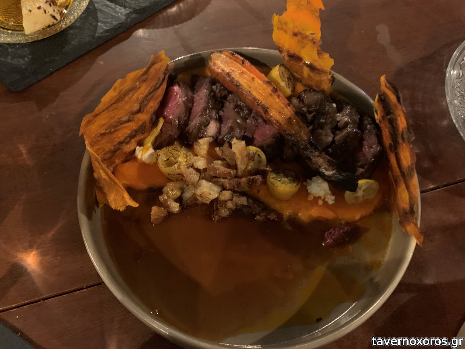 1 πρόβατο, λίπος στο ξύλο, καρότο ψητό και πουρές καρότου, πάρα πολύ καλό, θα το ήθελα λιγότερο ψημένο και με λίγο επιπλέον αλάτι.
