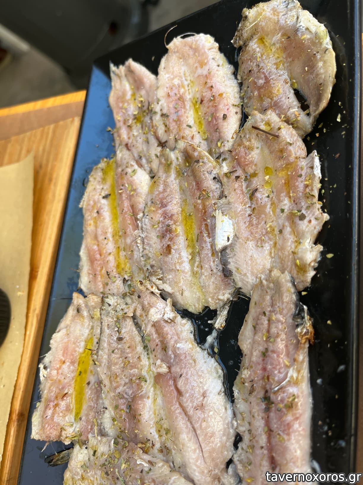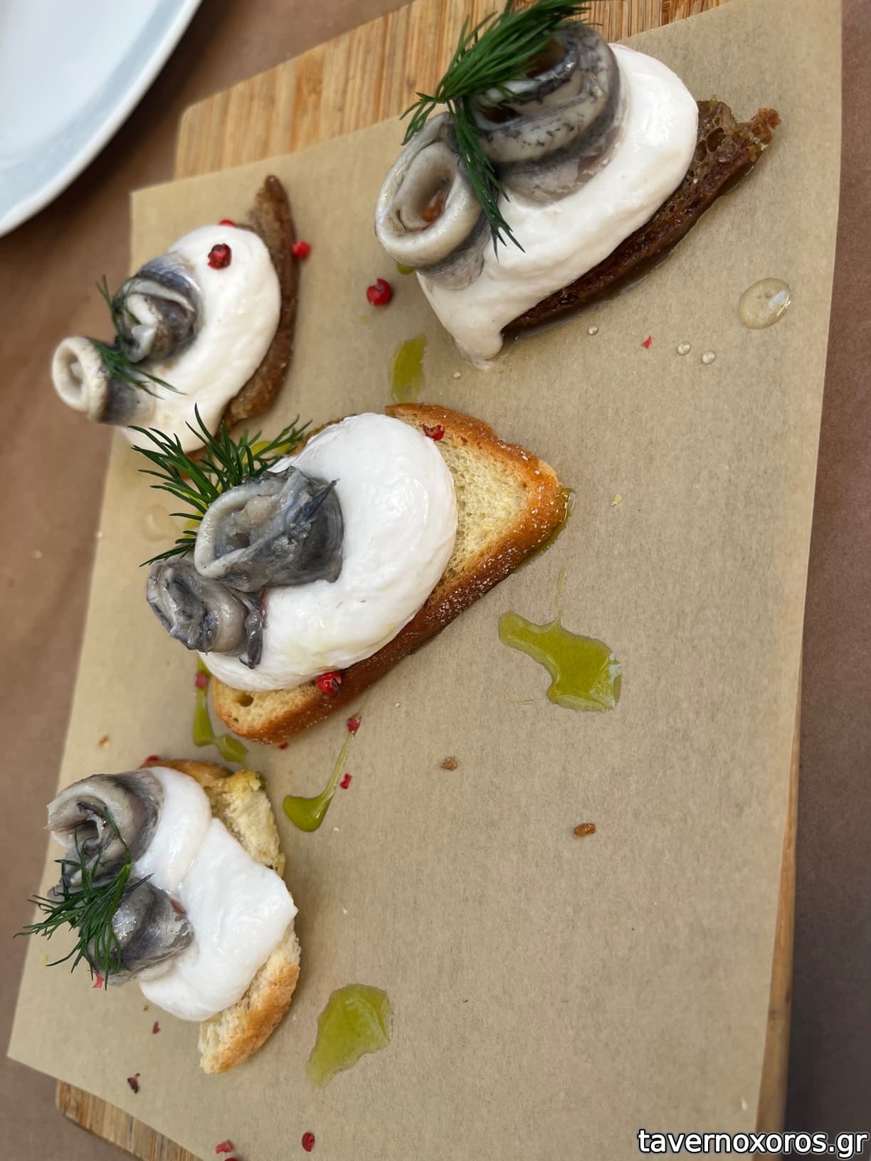 Γαύρος μαρινάτος, μους ταραμά τραγανό ψωμάκι (εξαιρετικό)
