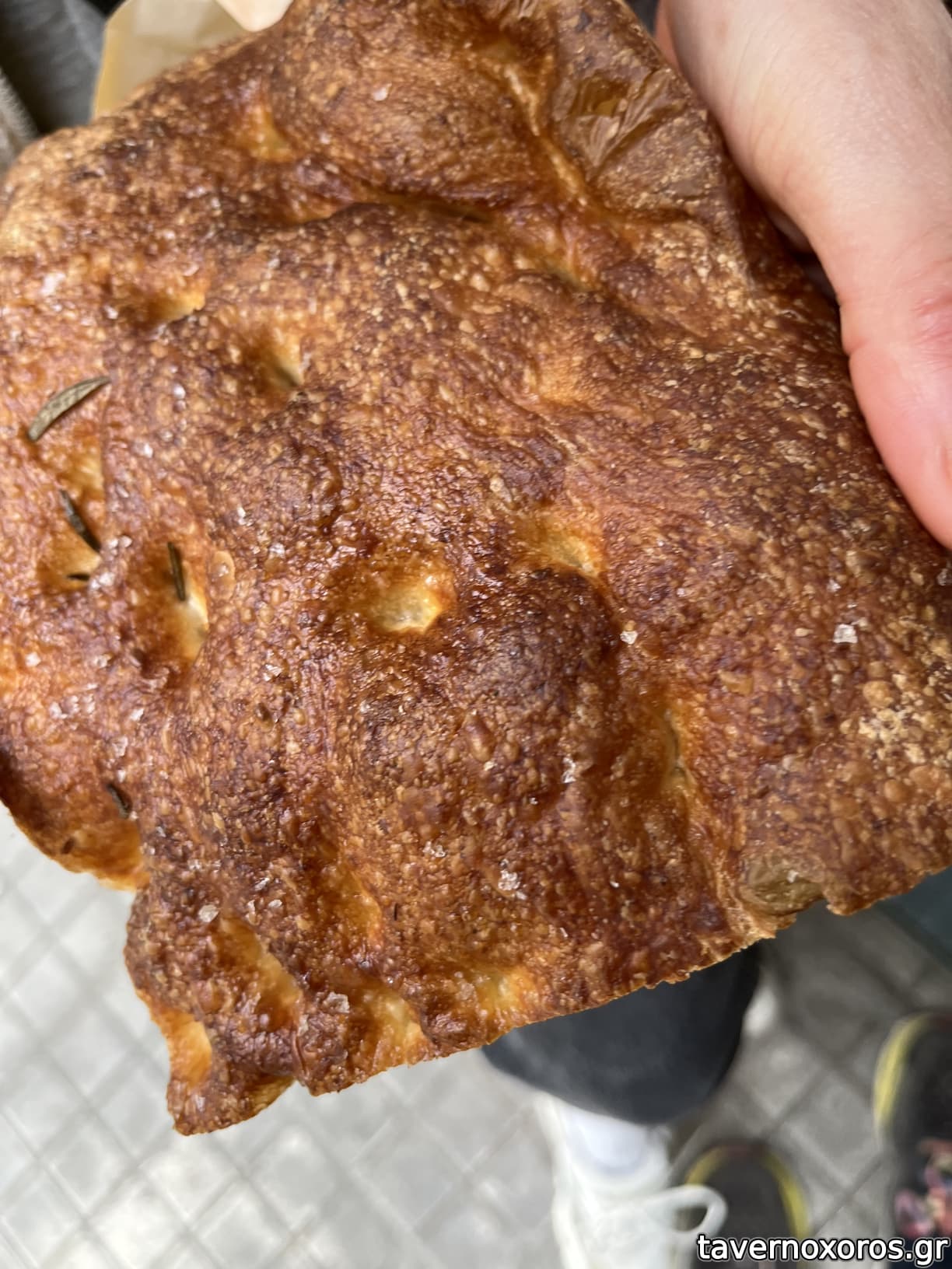 Αν και ο βασικός λόγος επίσκεψης ήταν να δοκιμάσω ψωμιά με προζύμι, δυστυχώς βρήκα μόνο φοκάτσια εκείνη την ώρα που ήταν πολύ καλή.