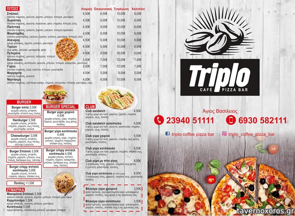 | Λέξεις κλειδιά | Τριπλό, #cafe-bar, #burgers, #σάντουιτς, #κοτόπουλο, #λουκάνικο, #club sandwich, #γύρος, #κεφτεδάκια, #σνίτσελ, #chicken wings |