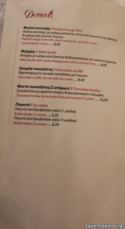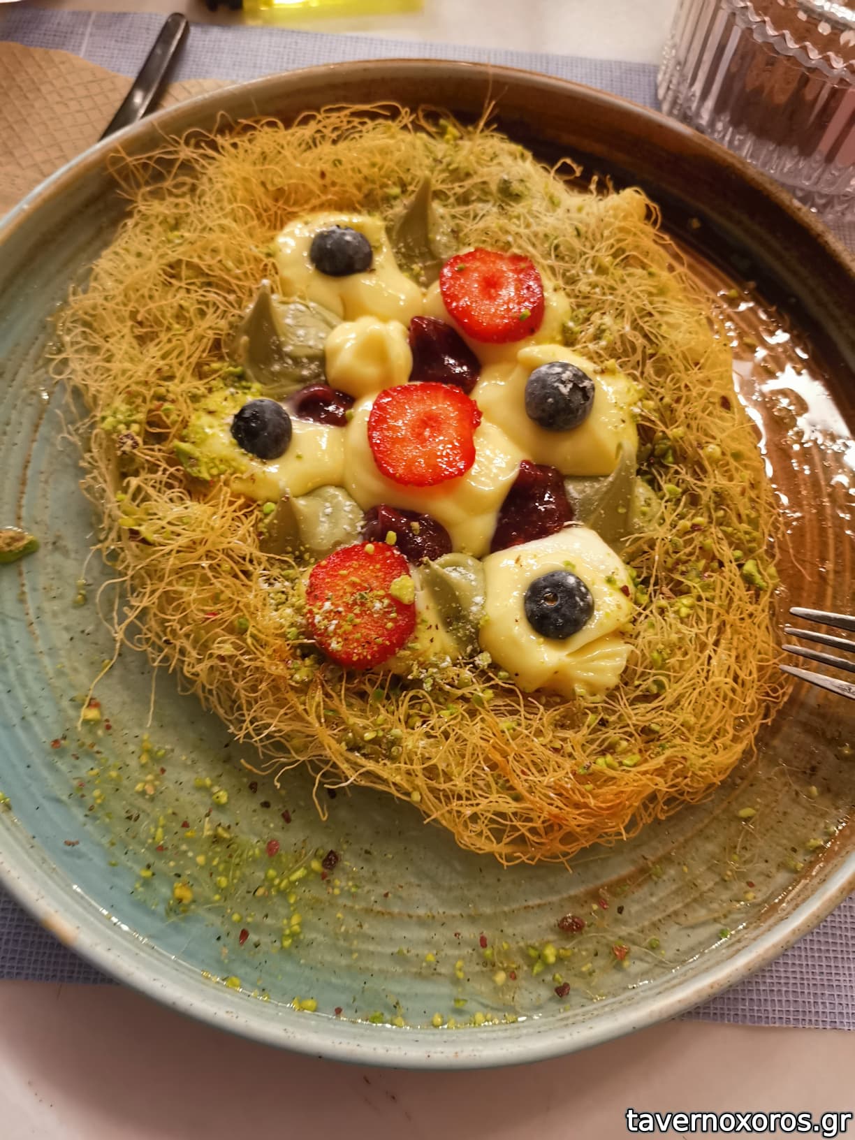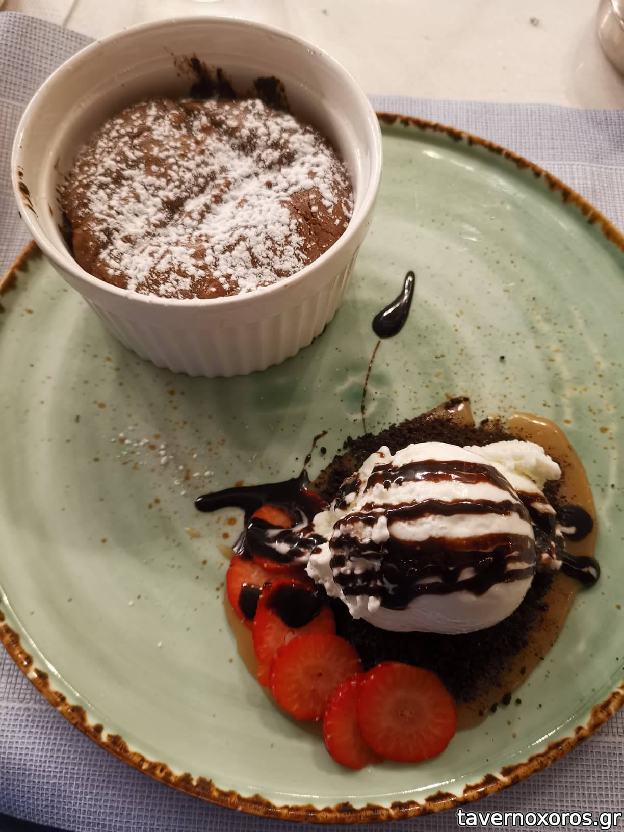 Το σουφλέ σοκολάτας με παγωτό βανίλια ήταν λαχταριστό, σερβίρεται καυτό ενώ ευτυχώς είναι αρκετά ελαφρύ και δεν σε λιγώνει. Σε καλό επίπεδο και η φωλιά κανταΐφι με κρέμα και ξηρούς καρπούς αλλά το μιλφειγ του ήταν άριστο