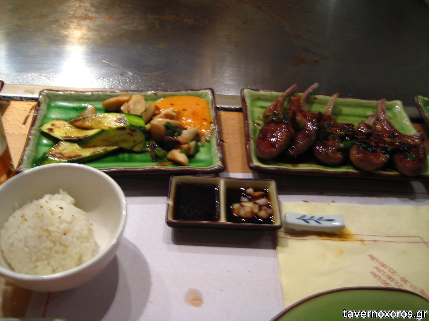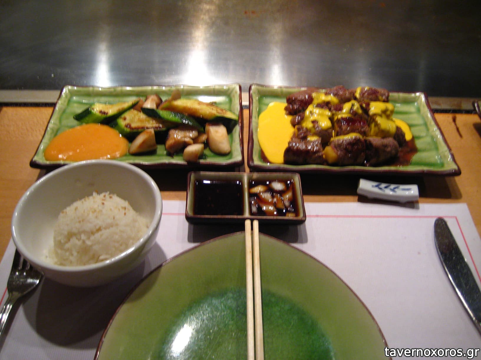 Το ξεχωριστό σε αυτό το μαγαζί είναι ότι ο μάγειρας μαγειρεύει το φαγητό μπροστά σου καθώς κάθεσαι γύρω από ένα τραπέζι στο μέσον του οποίου υπάρχει μια ζεστή πλάκα! Σημειωτέων ο μάγειρας προσπαθεί να κάνει και κόλπα (παπατζιλίκια) καθόσον ψήνει. Το φαγητό πολύ καλό πάντως αν και ακριβό.