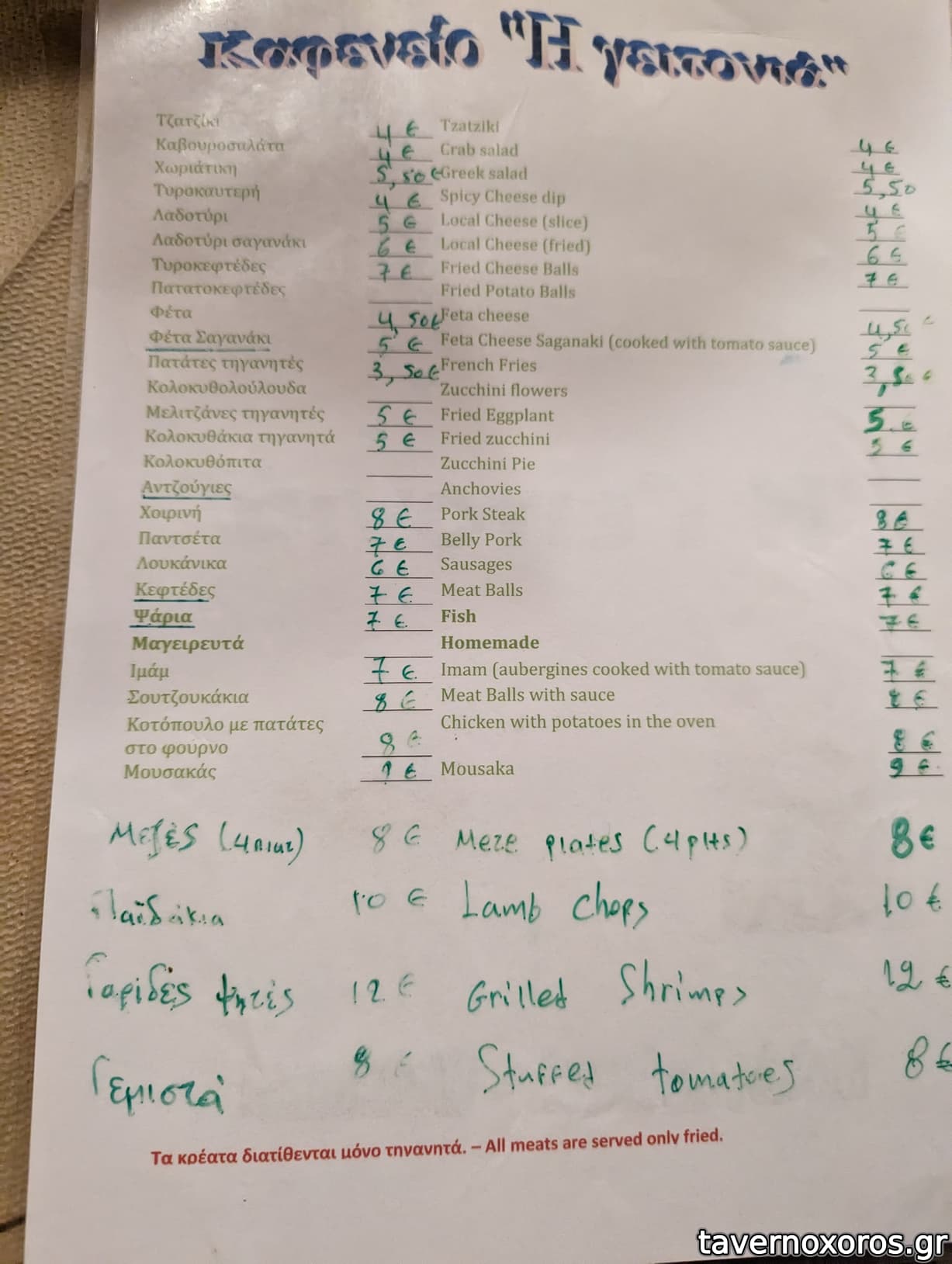 Φιλικότατοι οι άνθρωποι του μαγαζιού και με χιούμορ. Το φαγητό απλό, τα περισσότερα νόστιμα, τα μαγειρευτα τελείως σπιτική γεύση. Περάσαμε καλά, ήπιαμε αρκετά, πήγαμε και δεύτερη φορά. Τιμές όντως για το είδος του πάνω από το μέσο όρο του νησιού, μια χαρά όμως για την περιοχή.