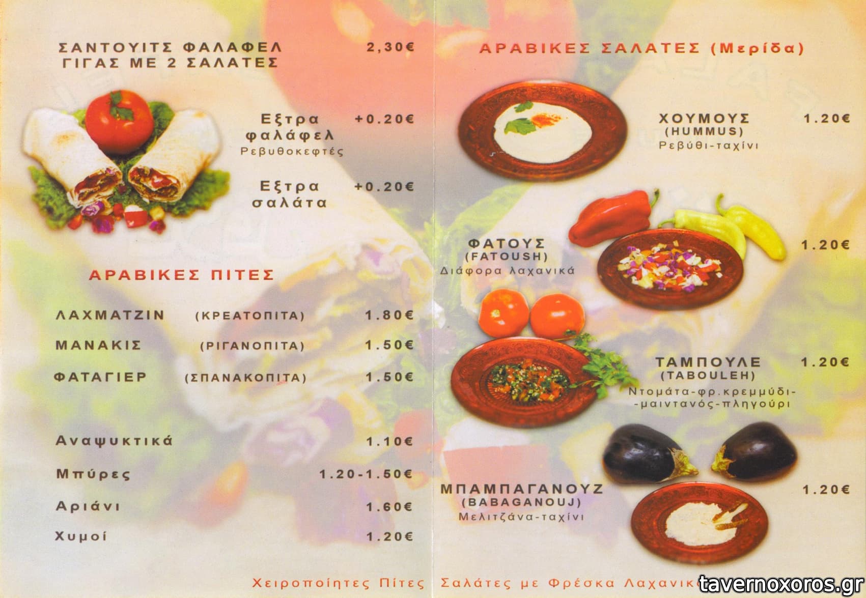 Έχω φάει αρκετές φορές. Αράβικη πίτα με φελάφελ και δύο σαλάτες στα 2 ευρώ. Από σαλάτες διαλέγει κανείς ανάμεσα σε μπαμπαγανούζ (μελιτζάνα), χούμους (ταχίνι, ρεβύθια), ταμπουλέ (πλιγούρι κ.α.) και φατούς (πράσινη). Μου έκανε εντύπωση η φρεσκάδα του ταμπουλέ, ένοιωθες την γεύση του λεμονιού και του μαιντανού ενώ είχε και δυόσμο (που πρέπει να έχει)! Όντως περιμένεις λίγο αλλά αξίζει. Τα φελάφελ μάλλον τα φτιάχνει ο ίδιος αφού είδα την προτελευταία φορά κάτι τεράστια σακούλια με ρεβύθια στην κουζίνα.