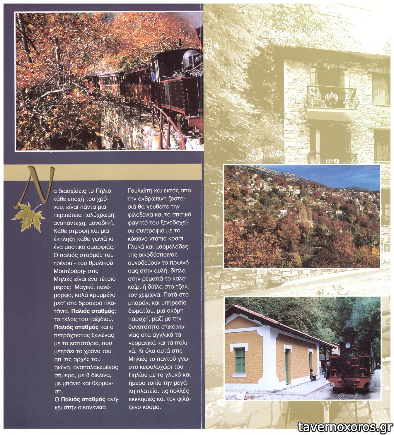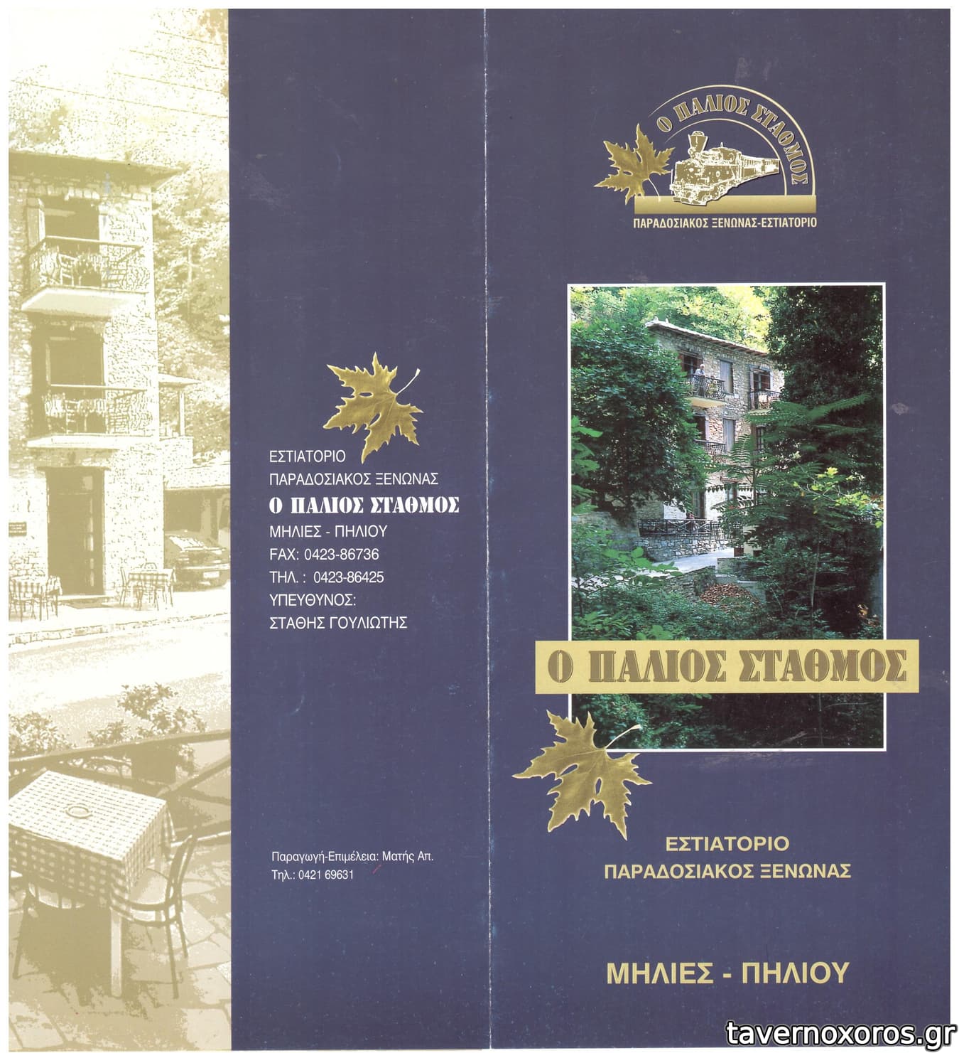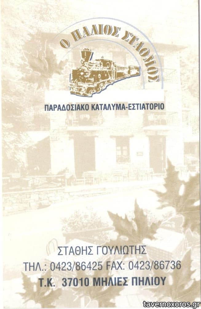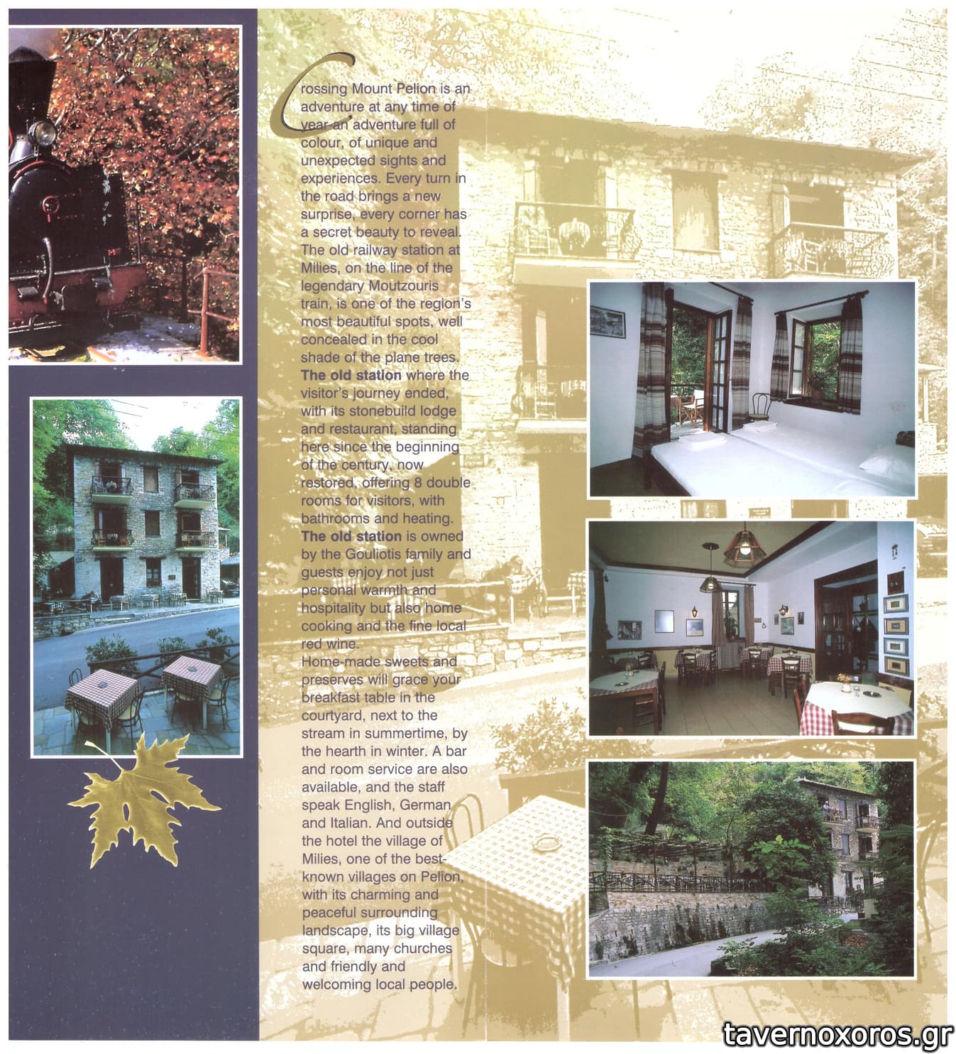 Σε πολύ όμορφη τοποθεσία , κοντά στον παλιό σιδηροδρομικό σταθμό στις Μηλιές (τον οποίο σχεδίασε ο Ιταλός αρχιτέκτονας Εβαρίστο Ντε Κίρικο, πατέρας του υπερρεαλιστή ζωγράφου Τζόρτζιο Ντε Κίρικο). Ειδικά την άνοιξη και το καλοκαίρι είναι απόλαυση να κάθεσαι κάτω από τα πανύψηλα δέντρα που κυκλώνουν το χώρο. Σερβίρει αρκετά πιάτα μαγειρευτά και ψητά και παραδοσιακές πίτες.Ντόπιο τσίπουρο και κόκκινο κρασί.
