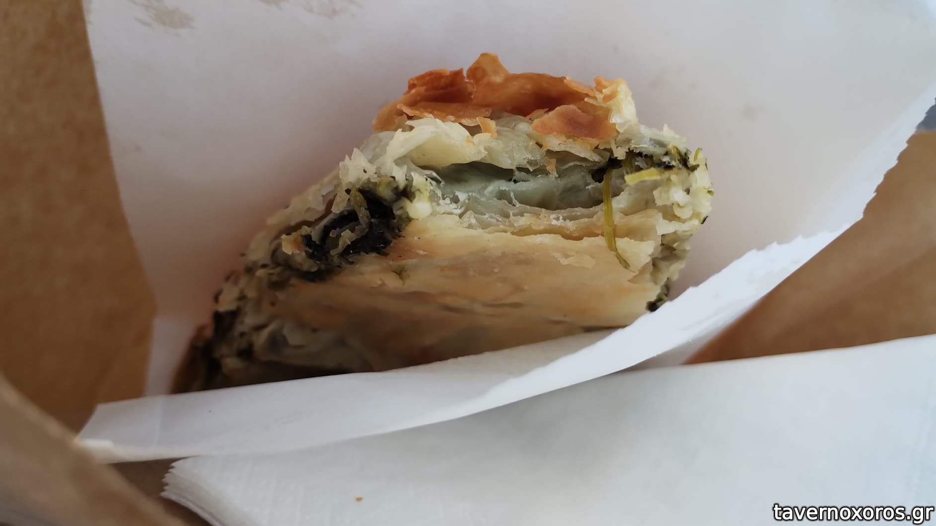 Σπανακόπιτα χωριάτικη δοκιμή. Το πάτωμα ήταν λευκό, σα να μην είχε ψηθεί. Επίσης είναι λαδερή (όχι ενοχλητικά) και λίγο αλμυρή. Παρόλα αυτά ήταν μετριοκαλή, το φύλλο τραγανό, γέμιση αρκετή. 1,5ε