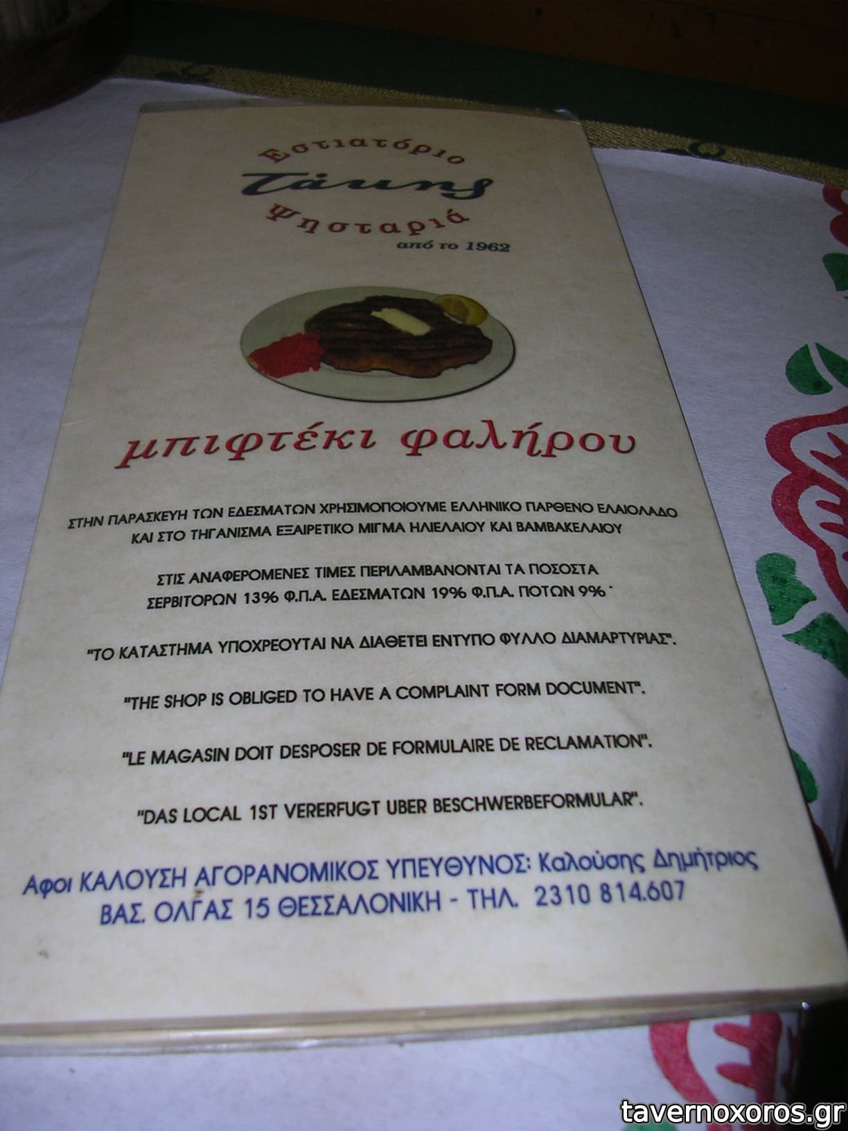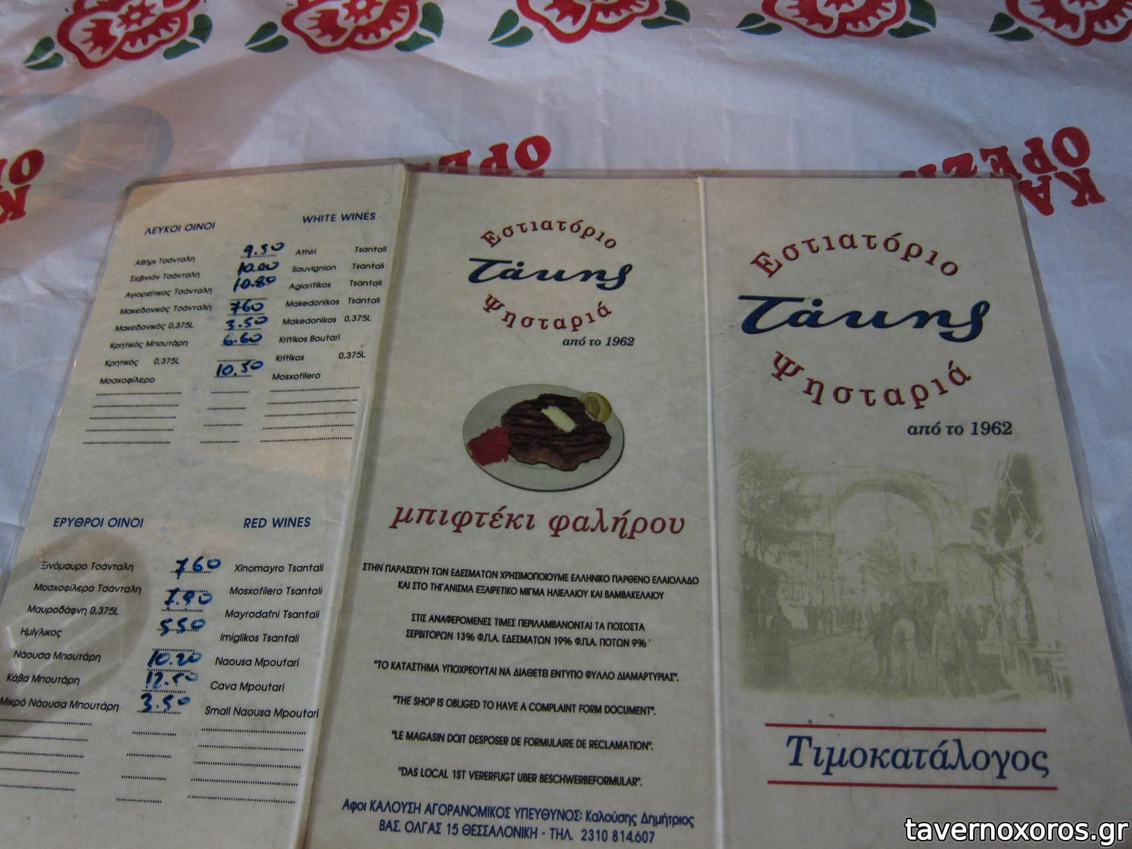 Ο Τάκης ο Καλούσης στεκότανε πάντα αγχωμένος στην πόρτα. Χαιρετούσε όλον τον κόσμο μιλώντας γλήγορα, και σχεδόν τους τραβούσε μέσα (Ω τον φίλο μου, καλώς τον φίλο μου, έλα να φας..). Στην πρόσοψη είχε ένα μπεν μαρί με τα μαγειρευτά που ποτέ δεν δοκίμασα.