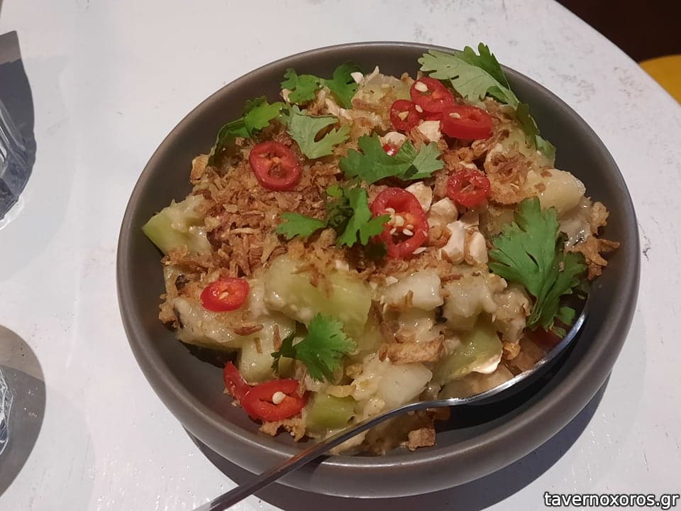 - Πεπόνι με καπνιστή μελιτζάνα, ξηρούς καρπούς, vinaigrette ταχίνι, μάραθο και αποξηραμένα κρεμμύδια. Απλά θεϊκό!