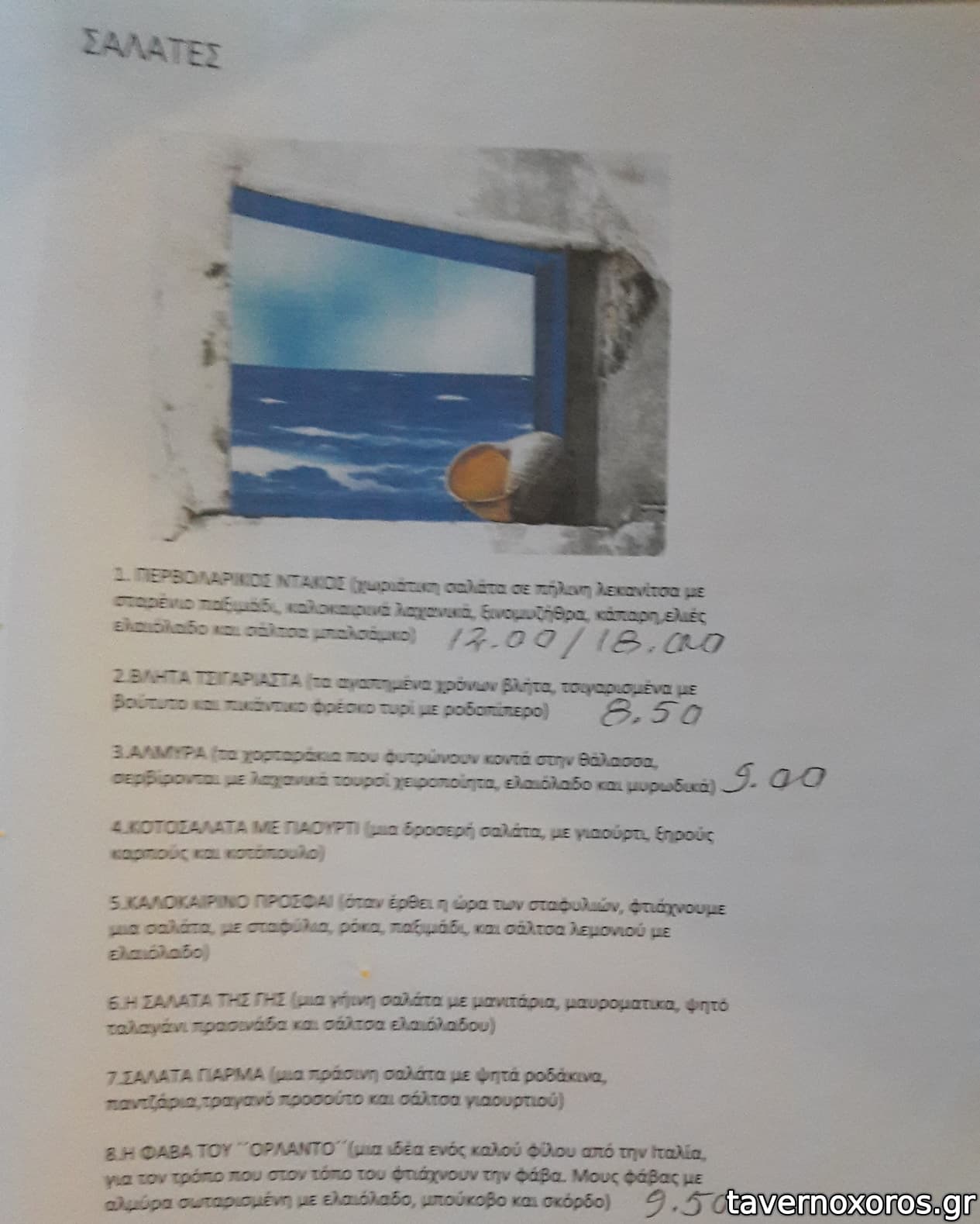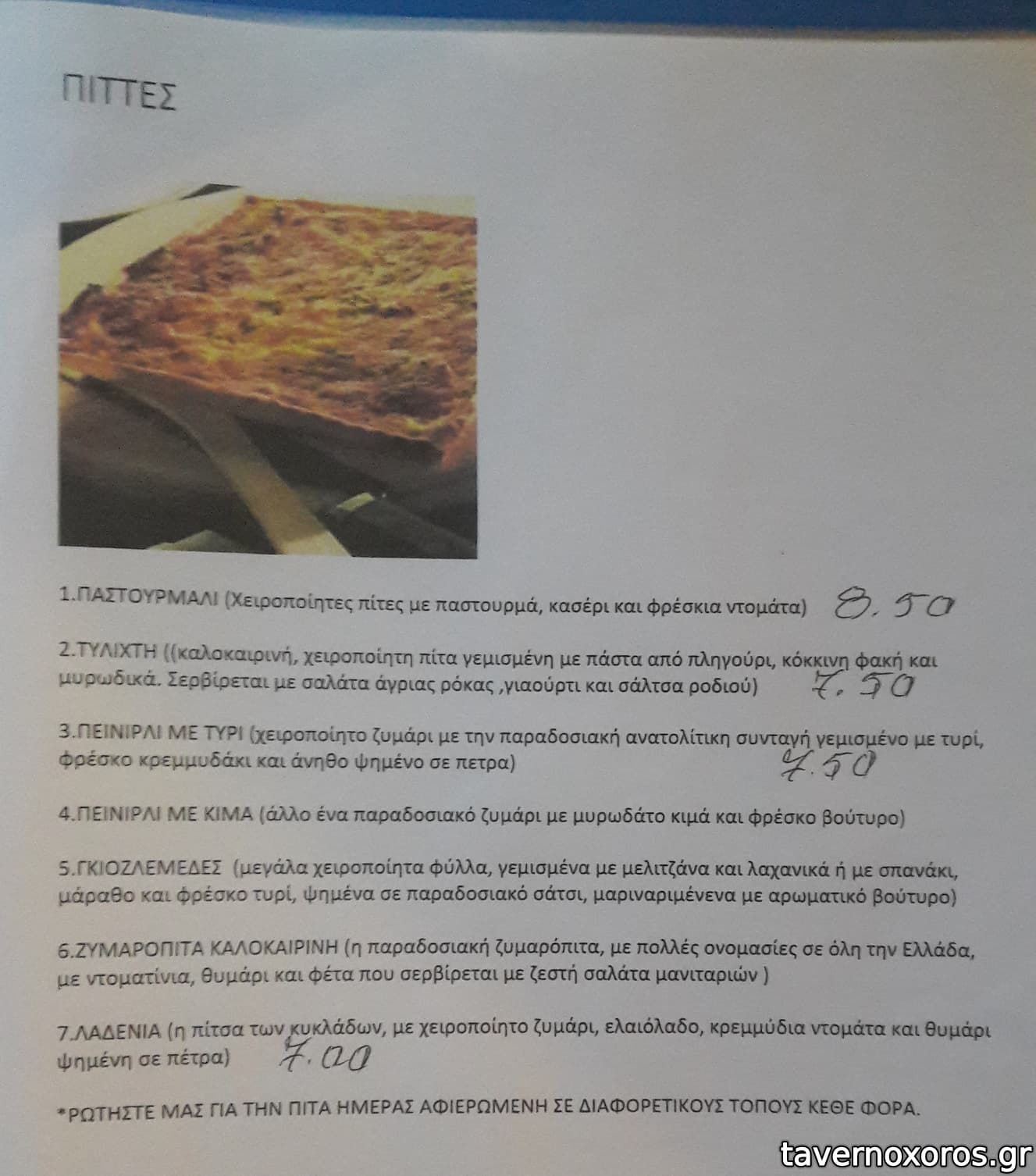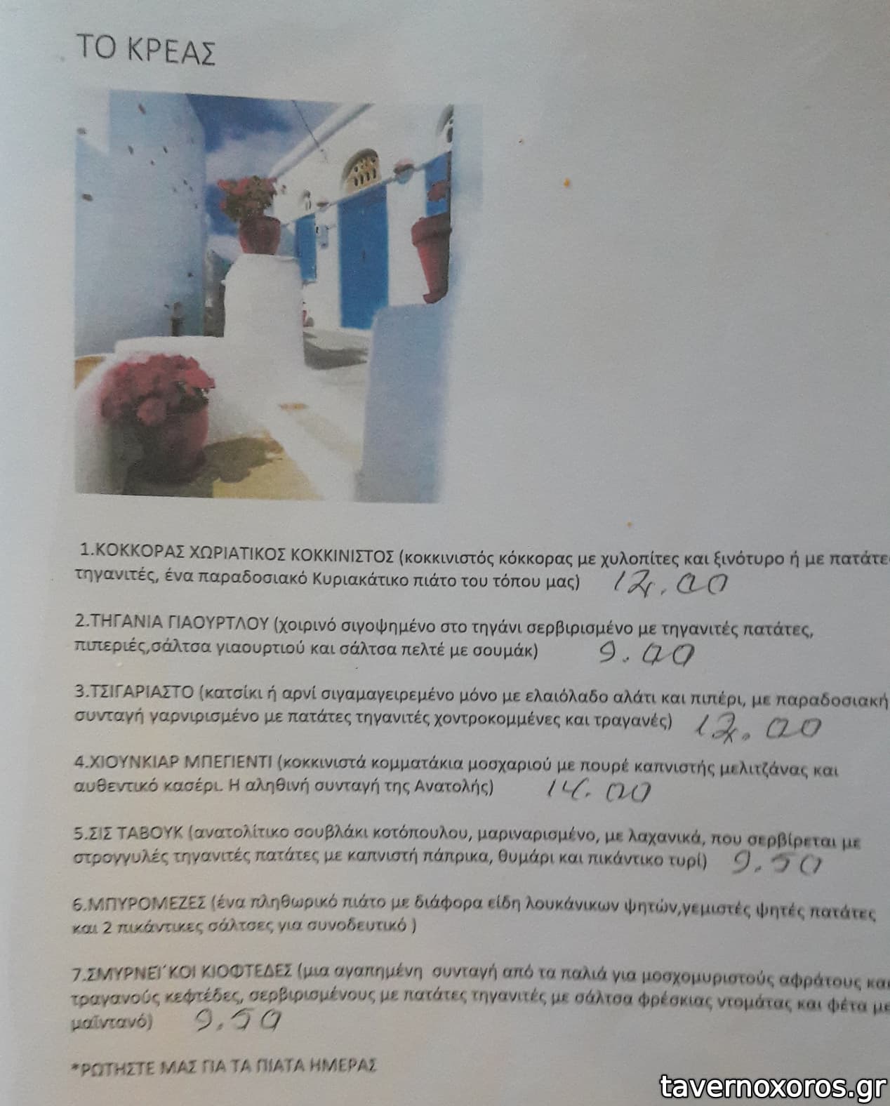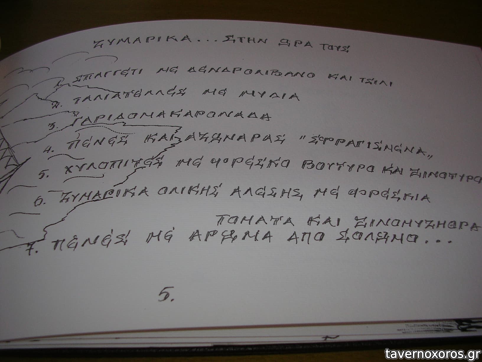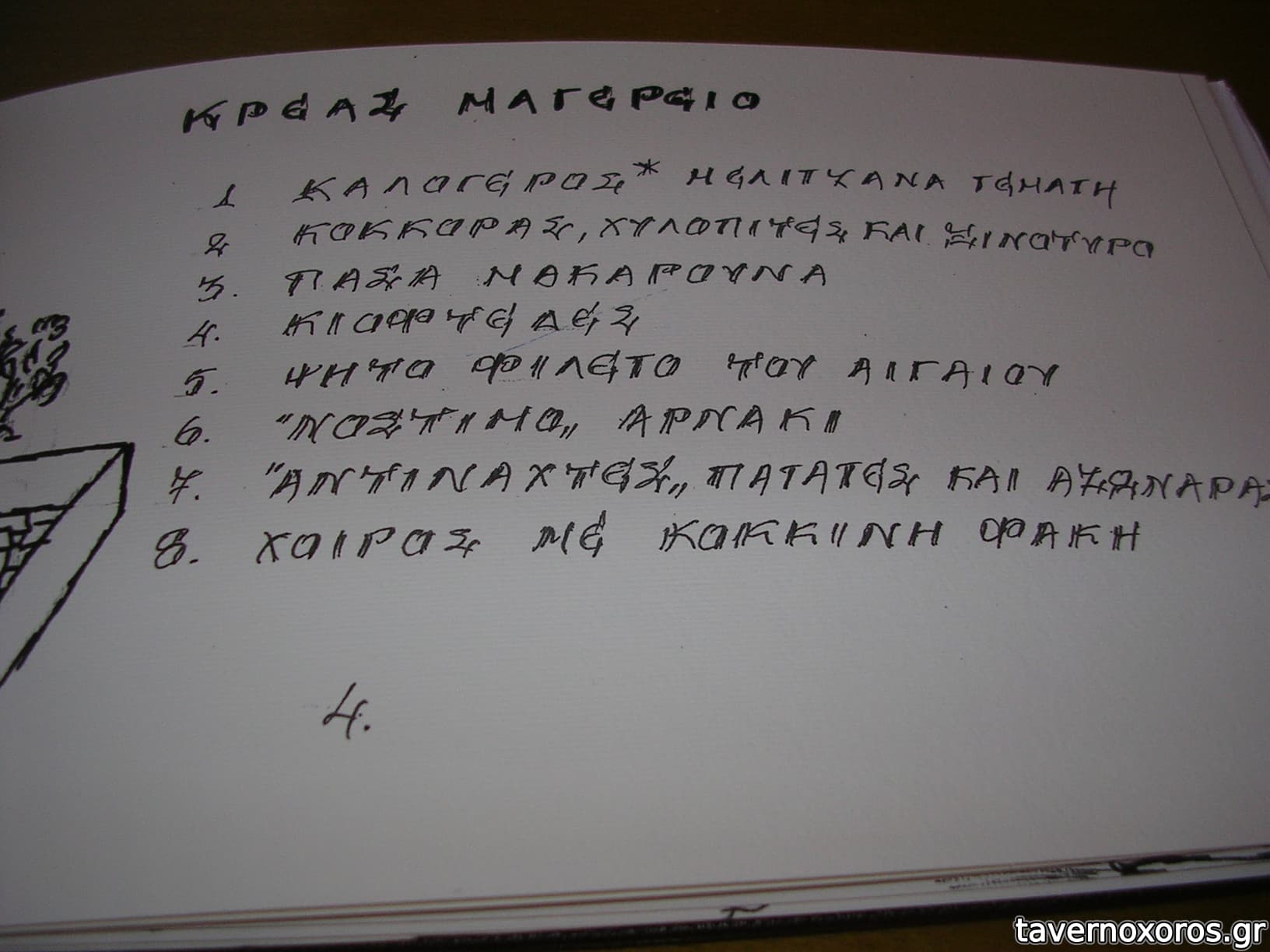 Πέρα από τα του καταλόγου έχει και διάφορα πιάτα κάθε ημέρα. Δοκιμάστηκαν γίγαντες τηγανιτοί που ήταν αδιάφοροι μιας και μέσα δεν ήταν μαλακοί και καταλάβαινες μόνο κουρκούτι, κόκορας κρασάτος κοκκινιστός (καλός αν και ήρθε κρύος) και τσιγαριαστό που ήταν καλό. Ροζέ κρασί από Νάξο καλό. Οι μερίδες του μεγάλες οπότε να είσαστε προετοιμασμένοι, οι τιμές τσιμπημένες.