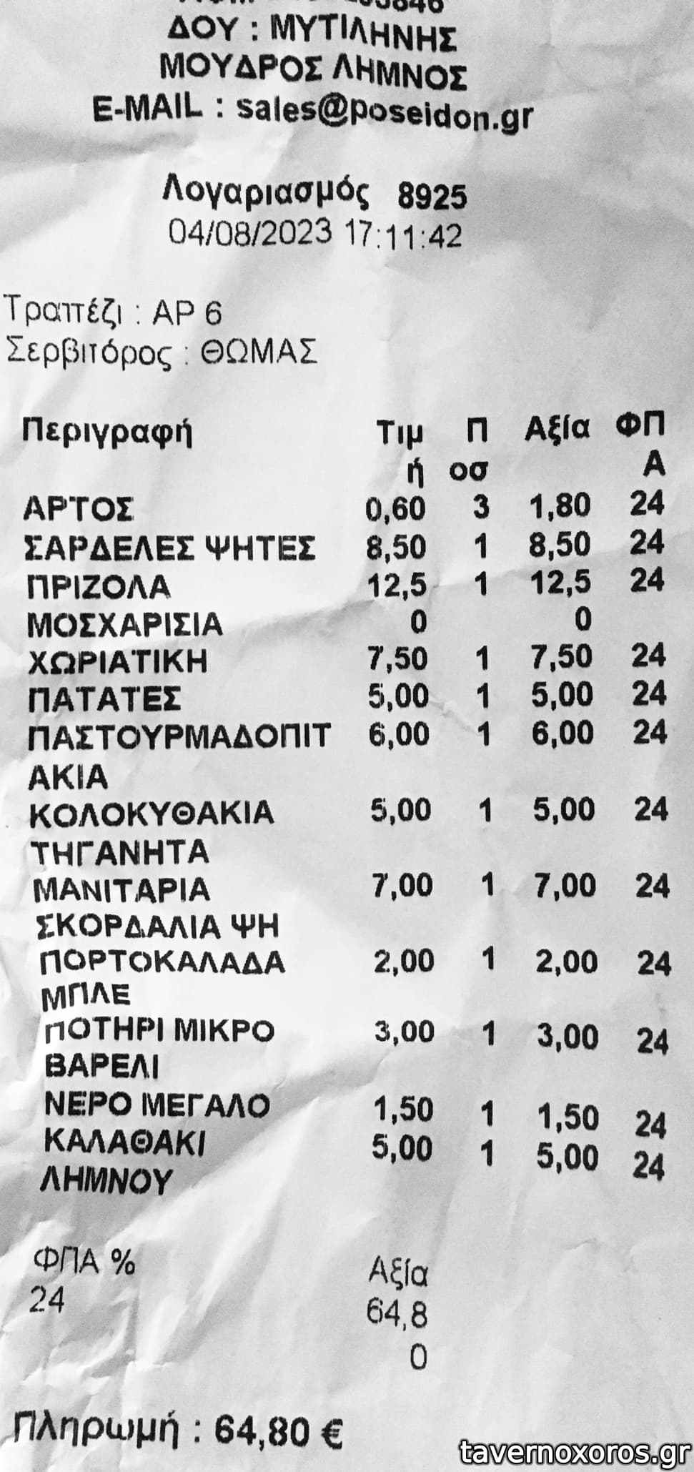 Διπλάσιες μερίδες. Μην παραγγείλτε αν δεν δείτε τις μερίδες πρώτα. Σαρδέλα τεράστια και μύριζε θάλασσα. Παστουρμαδόπιτα (καλή) με γλυκιά σάλτσα (καλό για μια μπουκιά), τυρί καλό, χωριάτικη καλή.