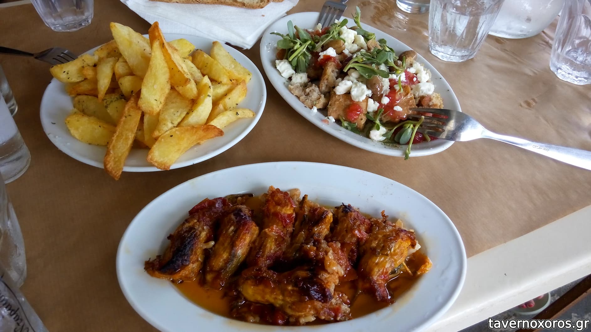 Γουρουνοπούλα ζόρικη (κομμάτια με πέτσα υπερτραγανή, τη δάγκωνες και ακουγόταν το κρακ μέχρι τα κτελ, ζουμερό κρέας, νόστιμο, οι πατάτες κολασμένες, πήραμε έξτρα μερίδα). Δοκιμάστηκαν επίσης βολβοί (ξυνόπικροι, φανταστικό μεζεδάκι για το τσίπουρο), ρεβυθοκεφτέδες (άρεσαν στους υπόλοιπους, εμένα όχι τόσο, νομίζω είχε δυόσμο μέσα που δεν τον συμπαθώ) και διάφορα άλλα καλούδια.