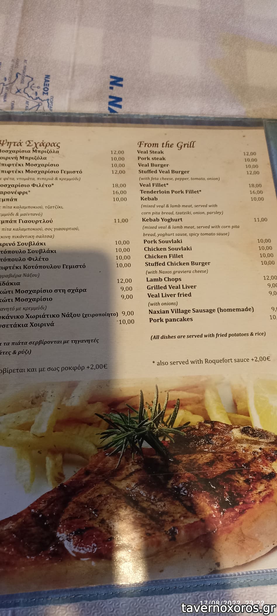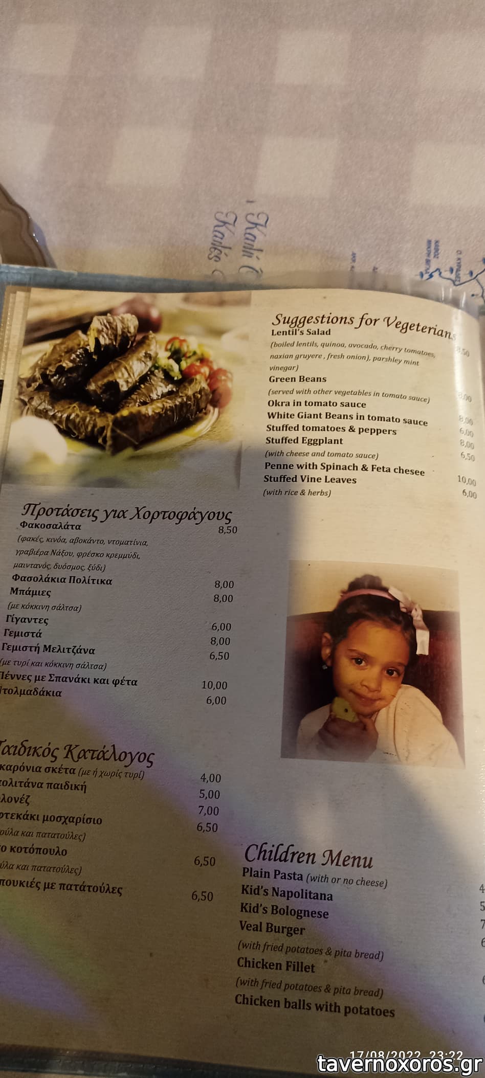 | Λέξεις κλειδιά | #παιδικό μενού, #σούβλες, #κεμπάπ, #φάβα, #ομελέτα, #τυροπιτάκια, #μελιτζάνα τηγανητή, #κολοκυθάκια, #πιπεριές, #κολοκυθοκεφτέδες, #μανιτάρια, #ντολμαδάκια, #μαστέλο, #φασόλια γίγαντες, #ξινομυζήθρα, #ποικιλία τυριών, #ταμπουλέ, #ντάκος, #μουσακάς, #παστίτσιο, #ρόστο, #καλόγερος, #μοσχαράκι λεμονάτο, #κοκκινιστό, #στιφάδο, #χοιρινό κατσαρόλας, #μπεκρή μεζές, #σουτζουκάκια σμυρνέικα, #αρνάκι, #κλέφτικο, #γεμιστά, #κεφτεδάκια, #κουνέλι στιφάδο, #σπεντζοφάι, #τηγανιά, #φασολάκια, #μπάμιες, #ζυμαρικά, #μακαρονάδες, #σνίτσελ, #μπακαλιάρος σκορδαλιά, #σαρδέλα, #γαρίδες, #μαριδάκι, #steaks, #χοιρινή, #μοσχαρίσια μπριζόλα, #μπιφτέκι, #σουτζουκάκια, #ψαρονέφρι, #μπιφτέκι γεμιστό, #σουβλάκι, #λουκάνικο, #συκώτι, #πανσέτα, #παϊδάκια |