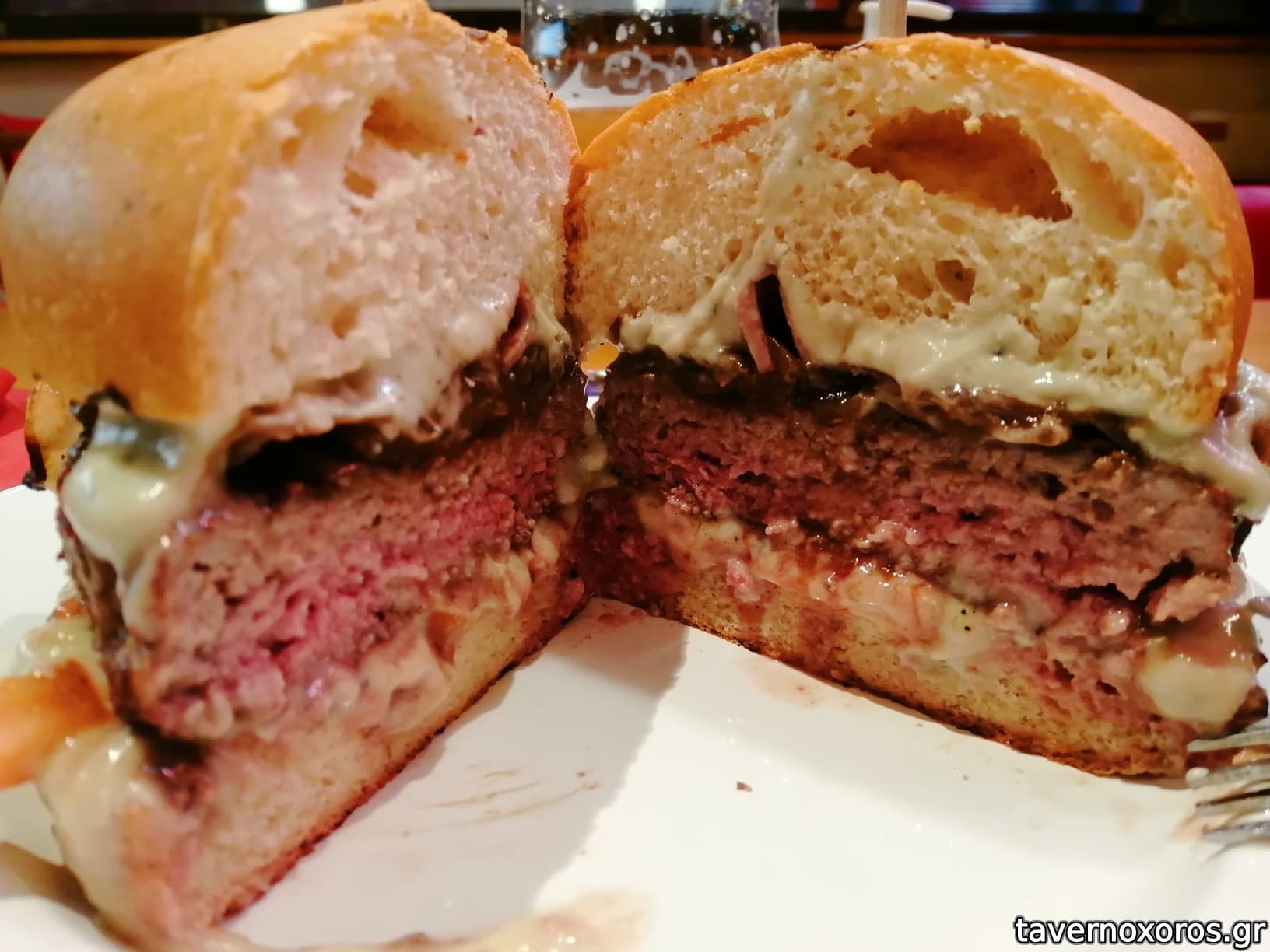 Beef patty, bacon, tomato, caramelised onions & blue cheese sauce on potato bun (δεν τρελάθηκα)