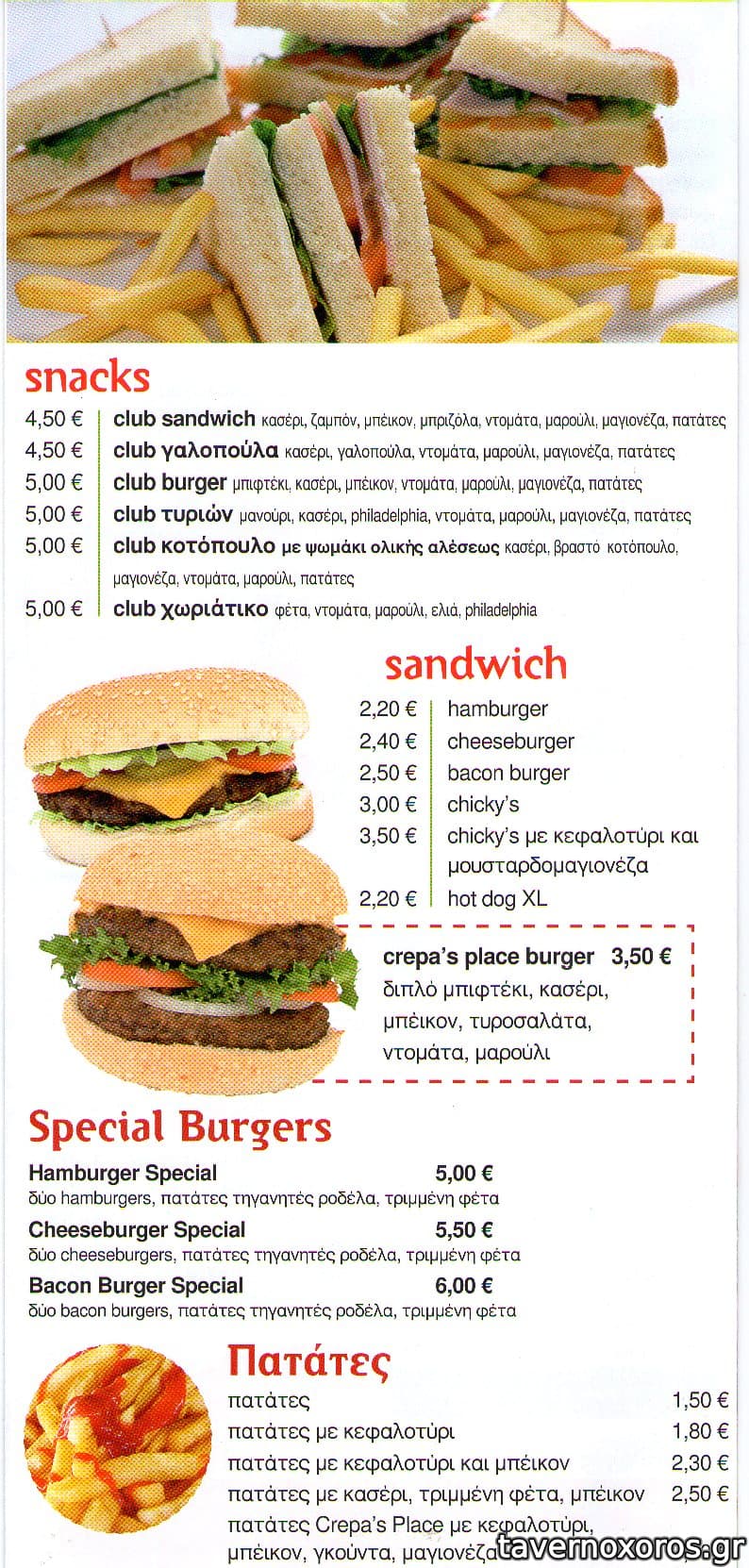 Χμμ... Αρκετά αξιοσημείωτο. Νόστιμο Club Sandwich με 4.00Ε. Συμφωνώ για τις κρέπες. Είναι όντως λίγο πιο ακριβές και λίγο πιο μικρές, αλλά νόστιμες. Επίσης πολύ καλό Hot-Dog. Μεγάλο, χωρίς πατάτες, 2.00Ε με φρέσκο ψωμάκι. Το επιλέγω αρκετά.
