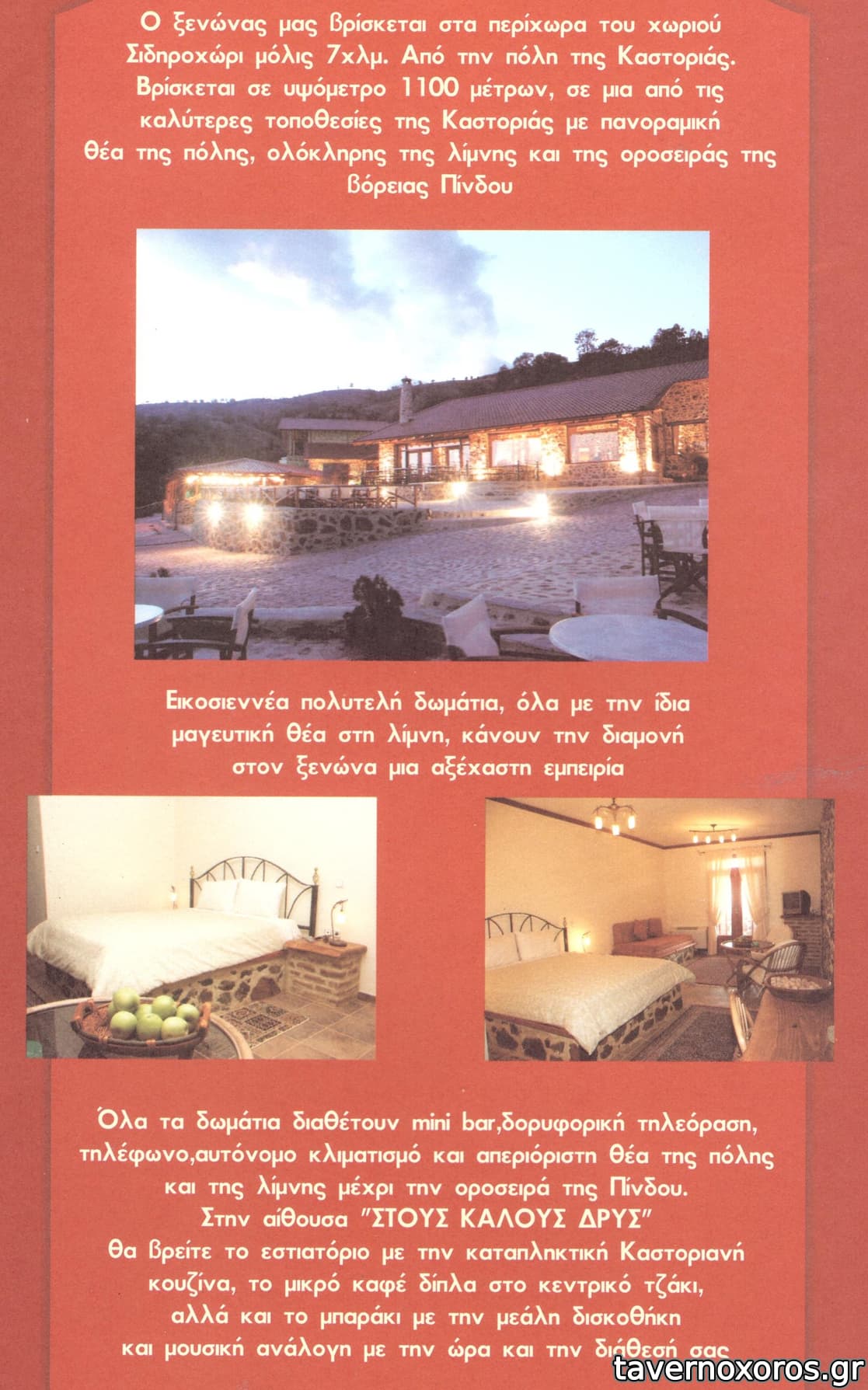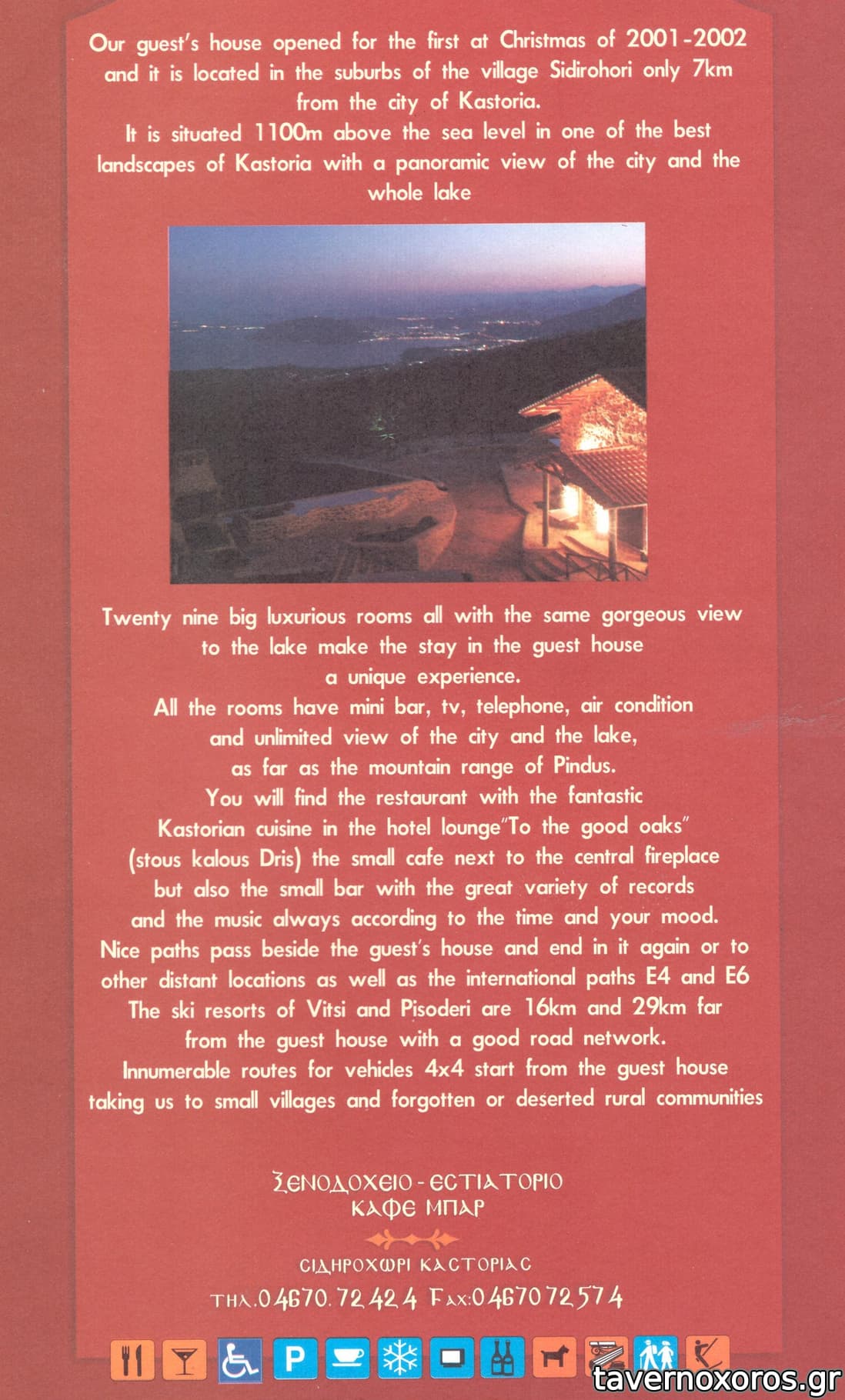 Διαμονή στον ξενώνα. Το εστιατόριο προσφέρει καταπληκτική θέα στη λίμνη. Καθήσαμε για βραδινό. Πήραμε χωριάτικη σαλάτα, κεφαλοτύρι ψητό, ψαρονέφρι με μέλι και σνίτσελ κοτόπουλο. Αμφότερα με φρέσκιες τηγανητές πατάτες. Συν ένα μπουκάλι κρασί ροζέ αφρώδες από το Αμύνταιο. Σέρβις ευγενικό, μουσική σωστή σε ένταση και ρεπερτόριο, τιμές λογικές.