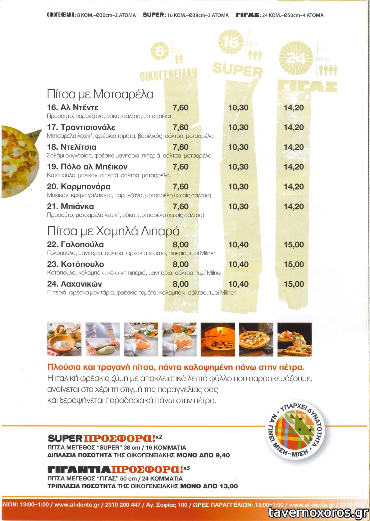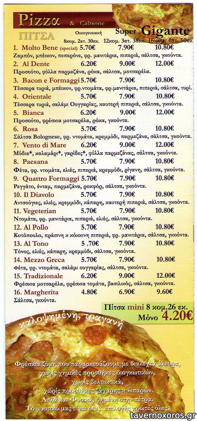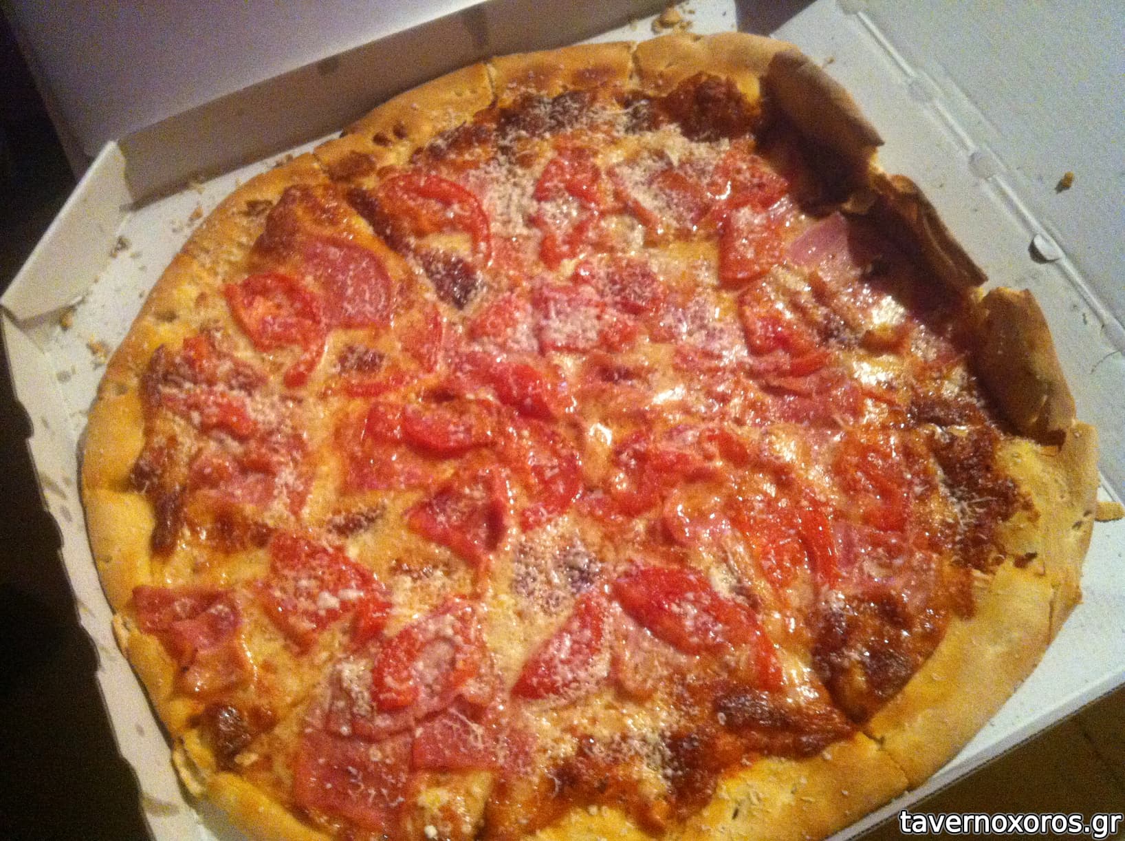 Πίτσα μέγεθος Super με μοτσαρέλα, ζαμπόν, μπέικον, φρέσκια ντομάτα, παρμεζάνα (10,4€ τιμή Ιανουαρίου 2012)