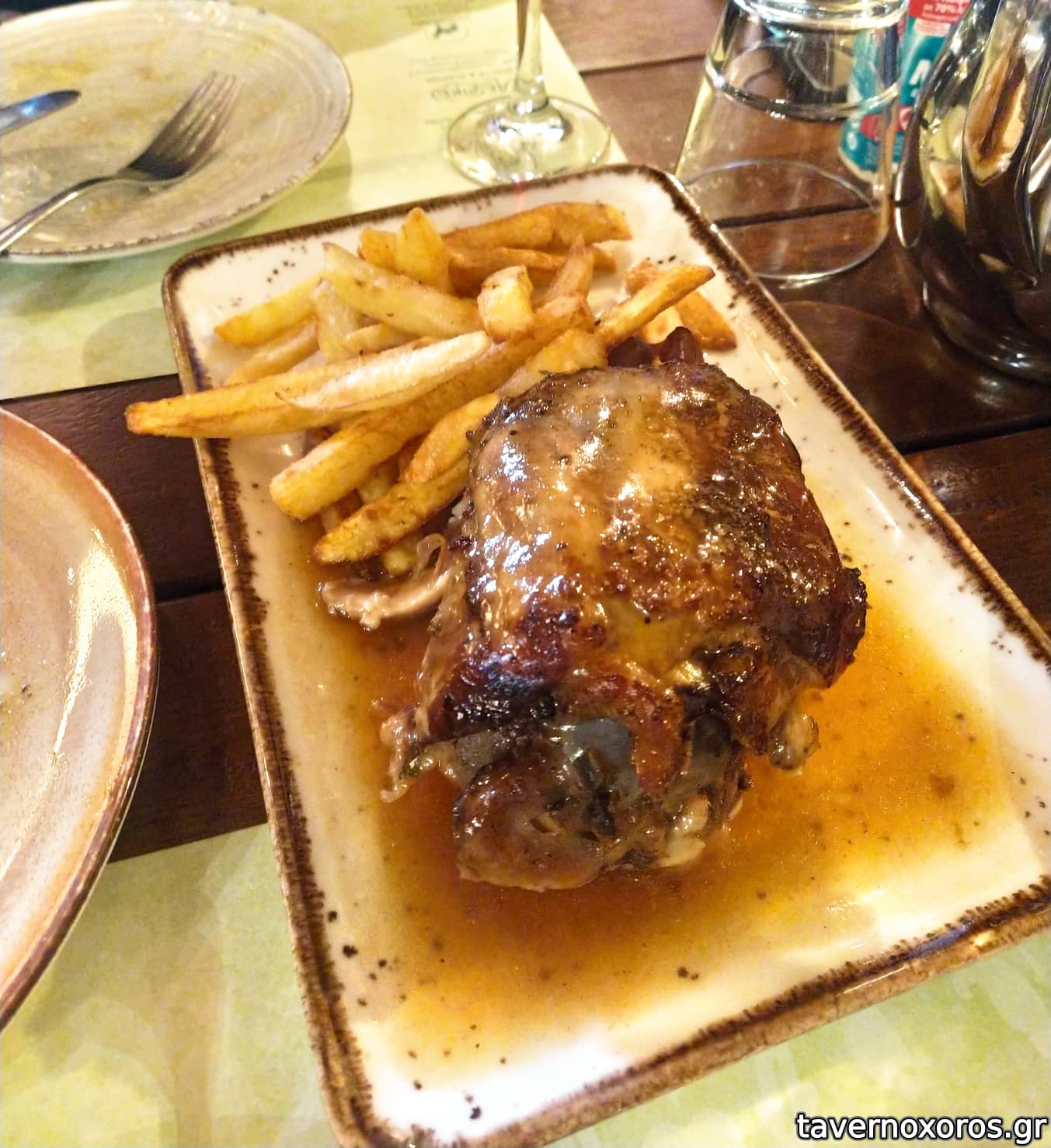 Μελωμένο χοιρινό κότσι στην γάστρα με πατάτες τηγανητές (πολύ καλό)